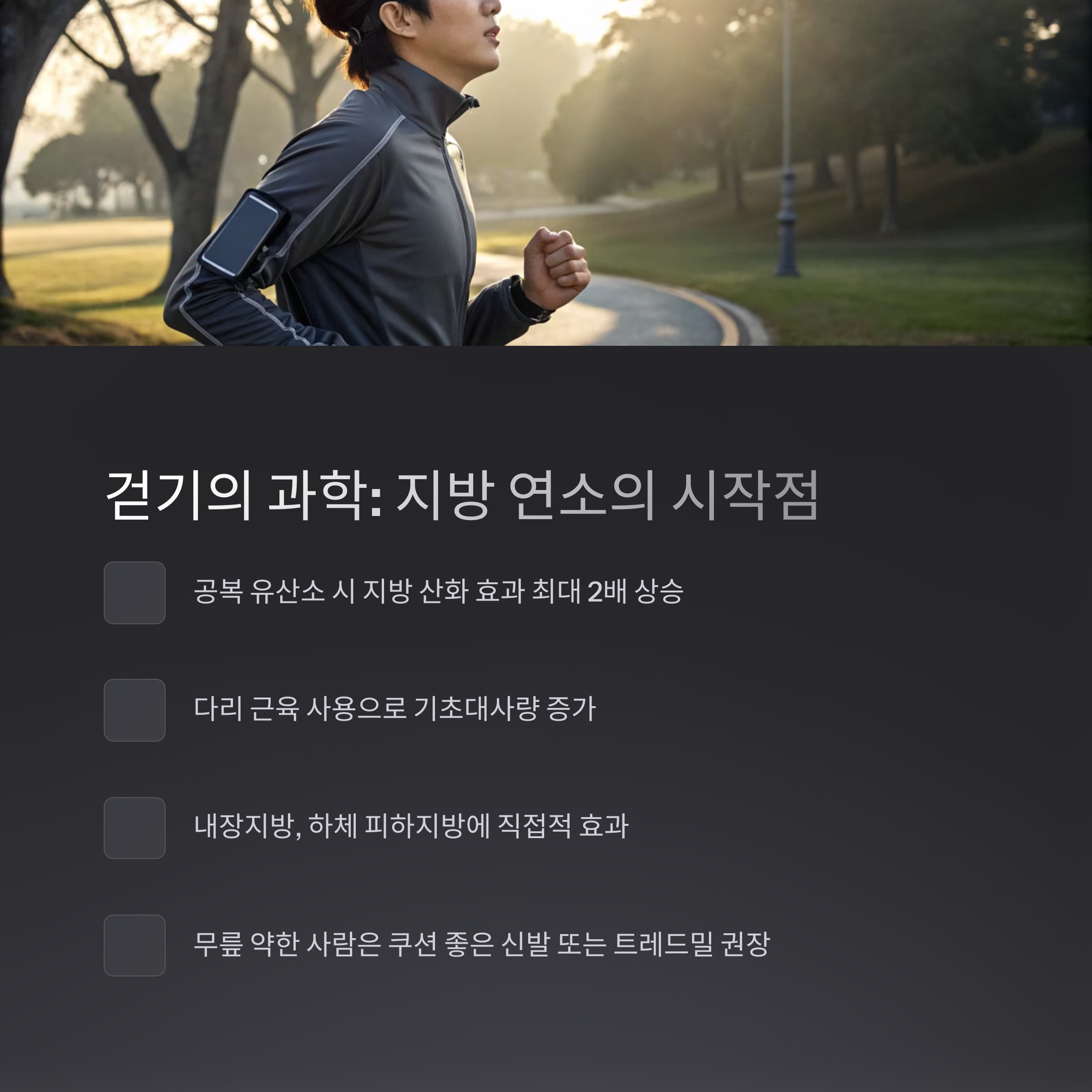 → 시속 5.5~6km, 약간 숨이 찰 정도가 이상적입니다. 천천히 걷는 것은 효과가 제한적입니다.