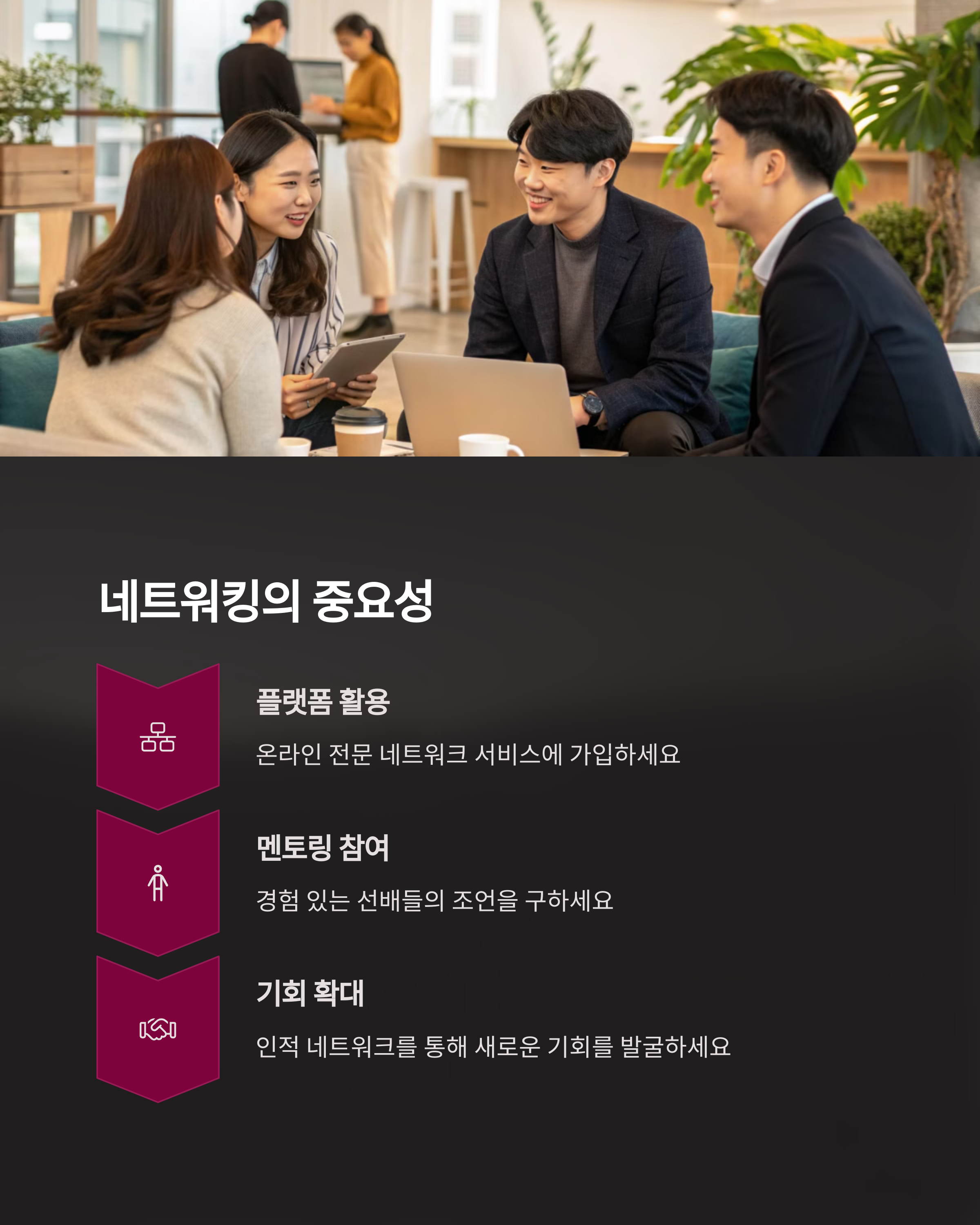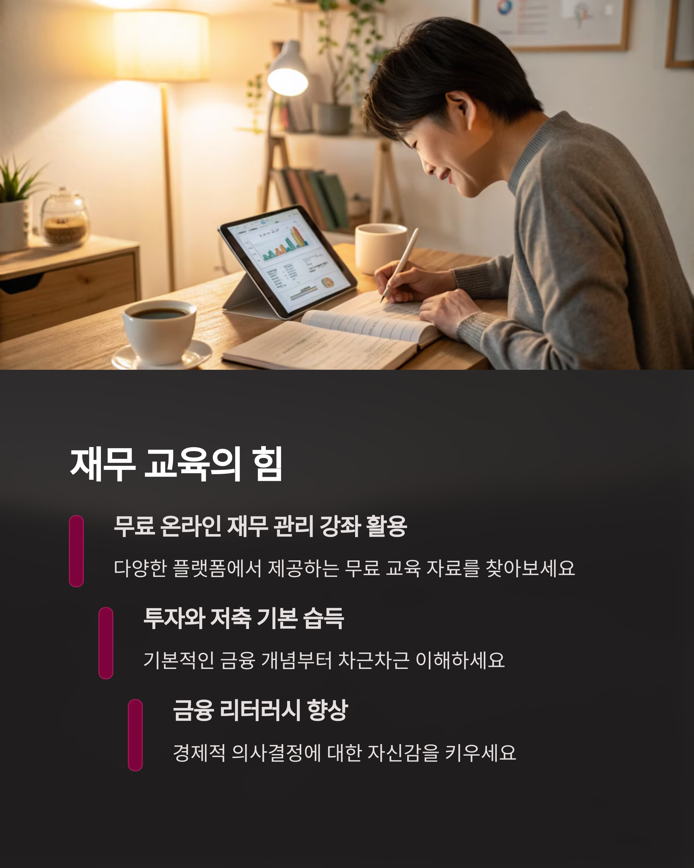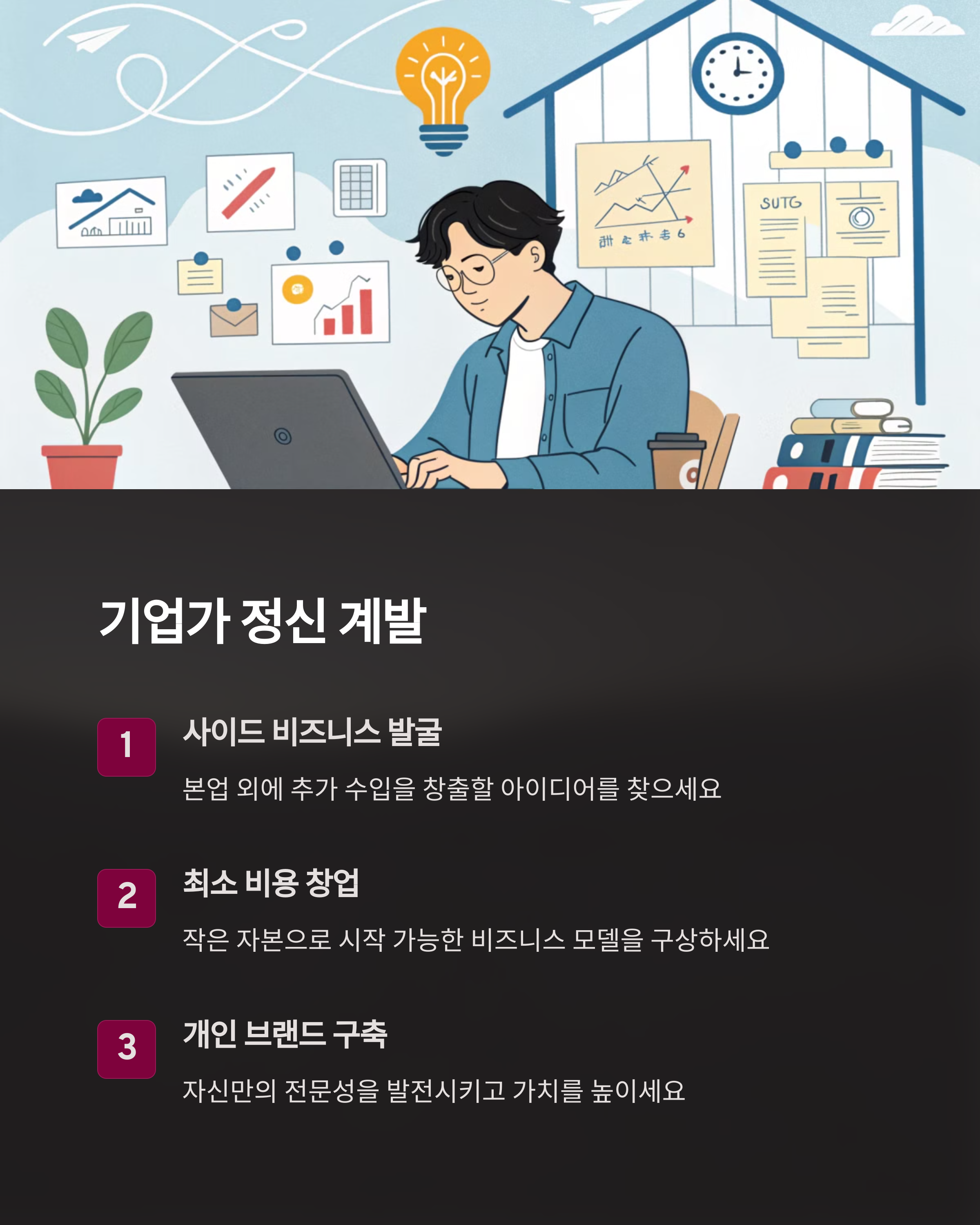 | 퇴근 후 활동으로 수입 다각화를 시도합니다. | 새는 돈을 파악하고 줄이는 실천이 중요합니다. | 시간과 돈을 지식에 투자해 미래를 준비합니다. |
