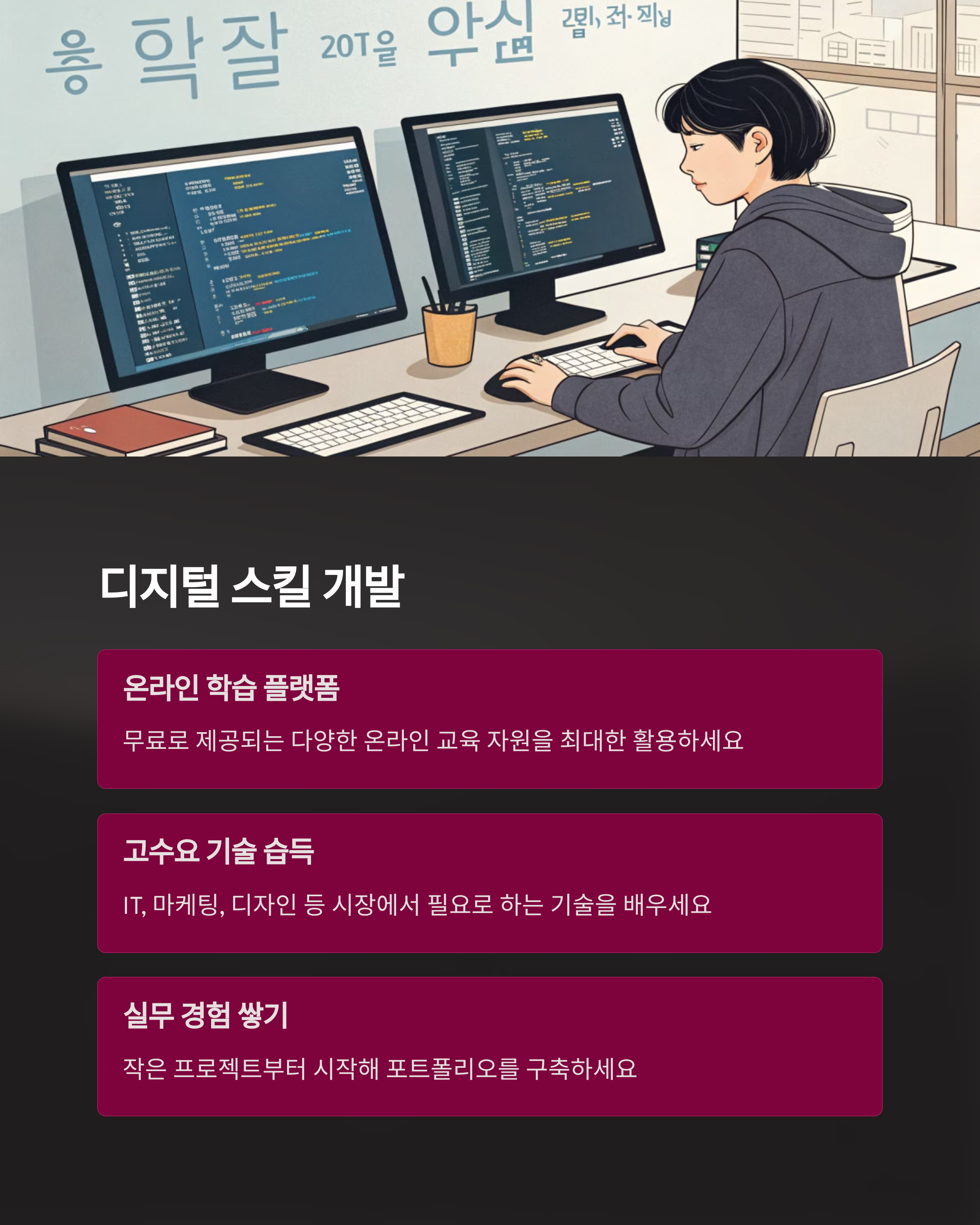 마지막으로 강조하고 싶은 부분은 장기적인 투자 마인드입니다. 지금 당장 수익이 없더라도 자신에게 시간을 투자하는 것, 예를 들면 자격증 공부, 코딩, 외국어, 금융 지식 등 내 삶의 자산이 되는 학습 활동은 결국 몇 년 뒤 내 소득을 완전히 바꿔놓는 근간이 됩니다. 우리는 매일 선택의 기로에 서 있습니다. 오늘의 선택이 내일의 경제를 만든다는 사실, 잊지 마세요.