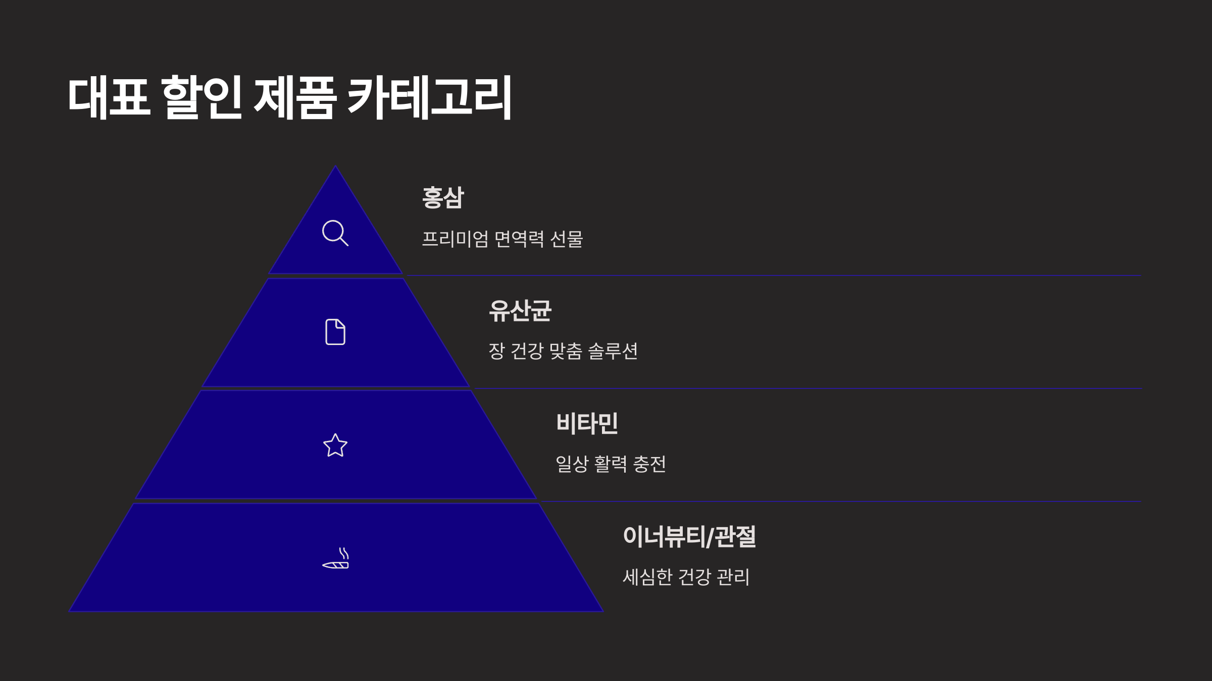 목적에 따라 홍삼, 유산균, 비타민 등 카테고리별 상품이 깔끔하게 정리되어 있어 쇼핑이 쉬워요.