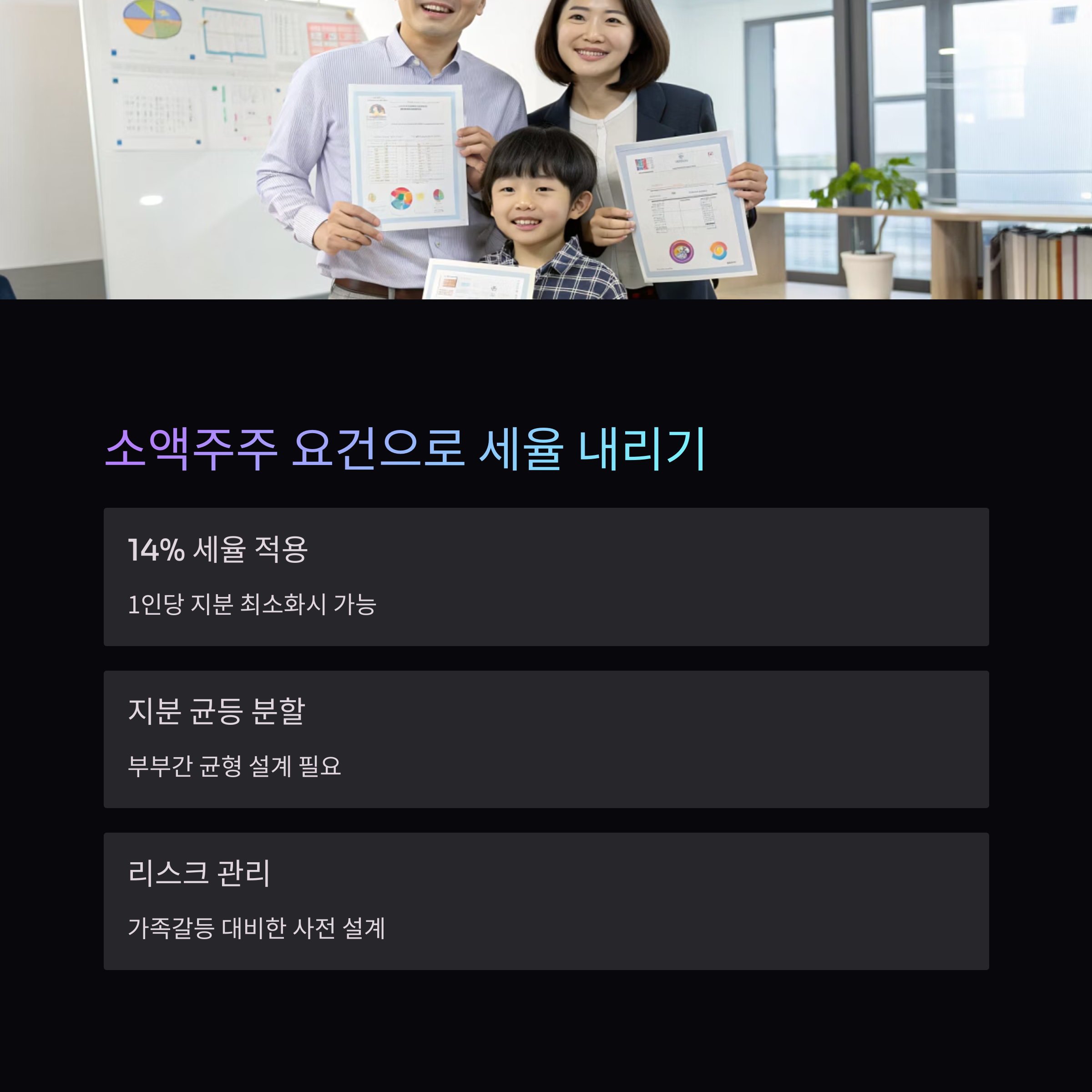 가족법인 설립 시 지분 분배를 전략적으로 설계하면 소액주주로 인정받아 세제 혜택을 볼 수 있습니다.