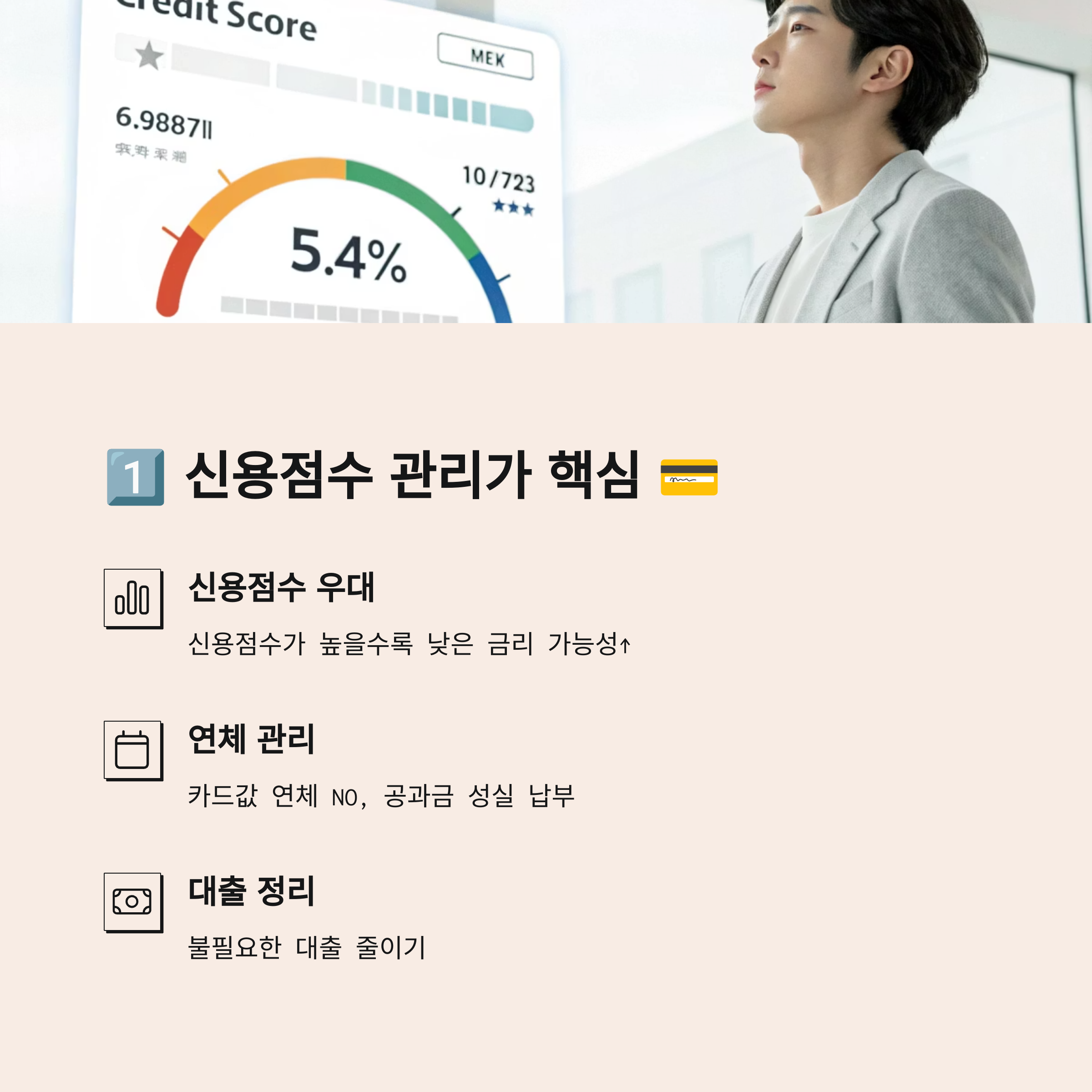 카드값 연체 없는 생활, 불필요한 대출 줄이기, 통신비나 공과금 성실 납부 같은 작은 습관들이 모여 신용점수를 올리는 지름길이 됩니다.