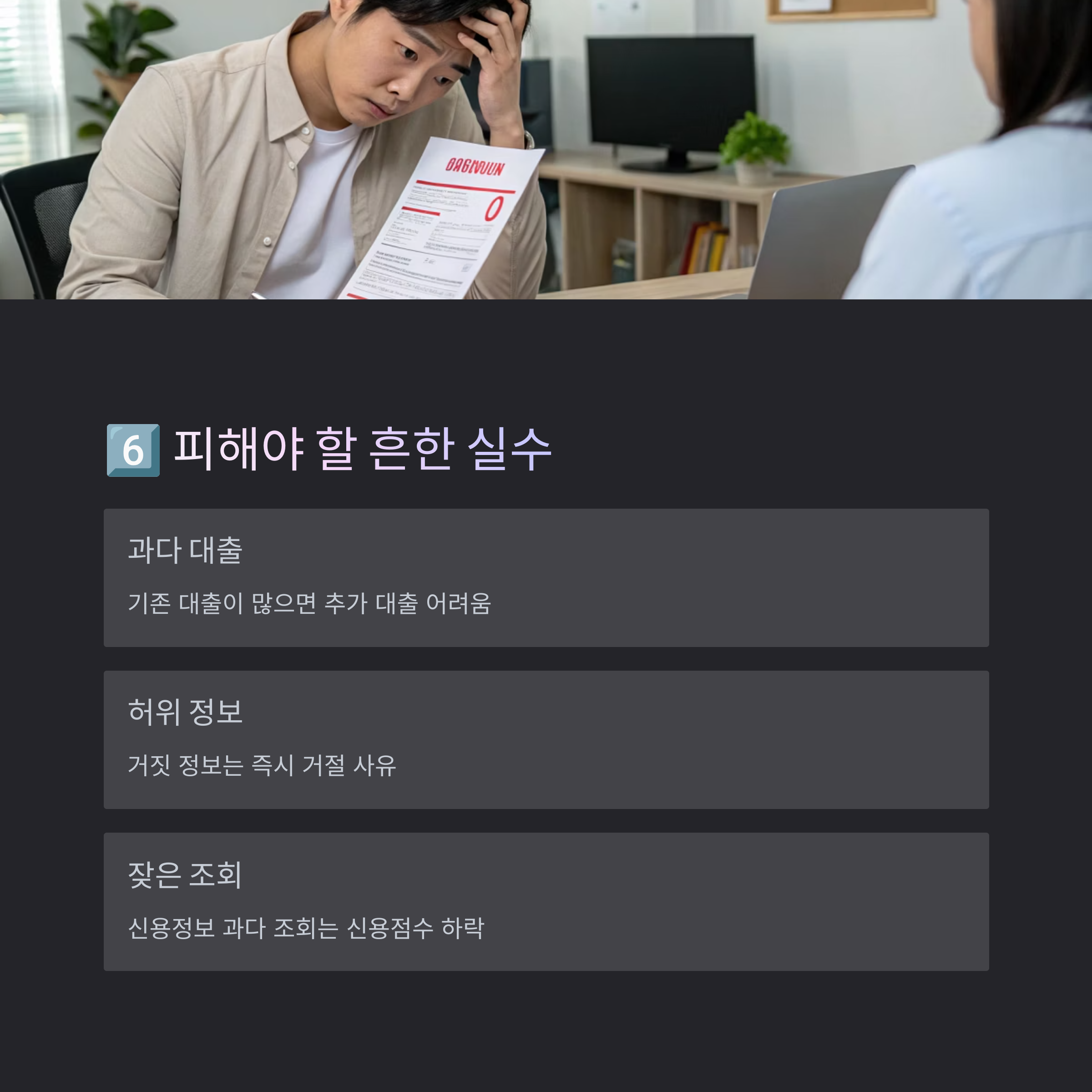 최근 6개월 내 연체 이력은 심사에 큰 영향을 줍니다. 자동이체 설정으로 실수 방지하세요!