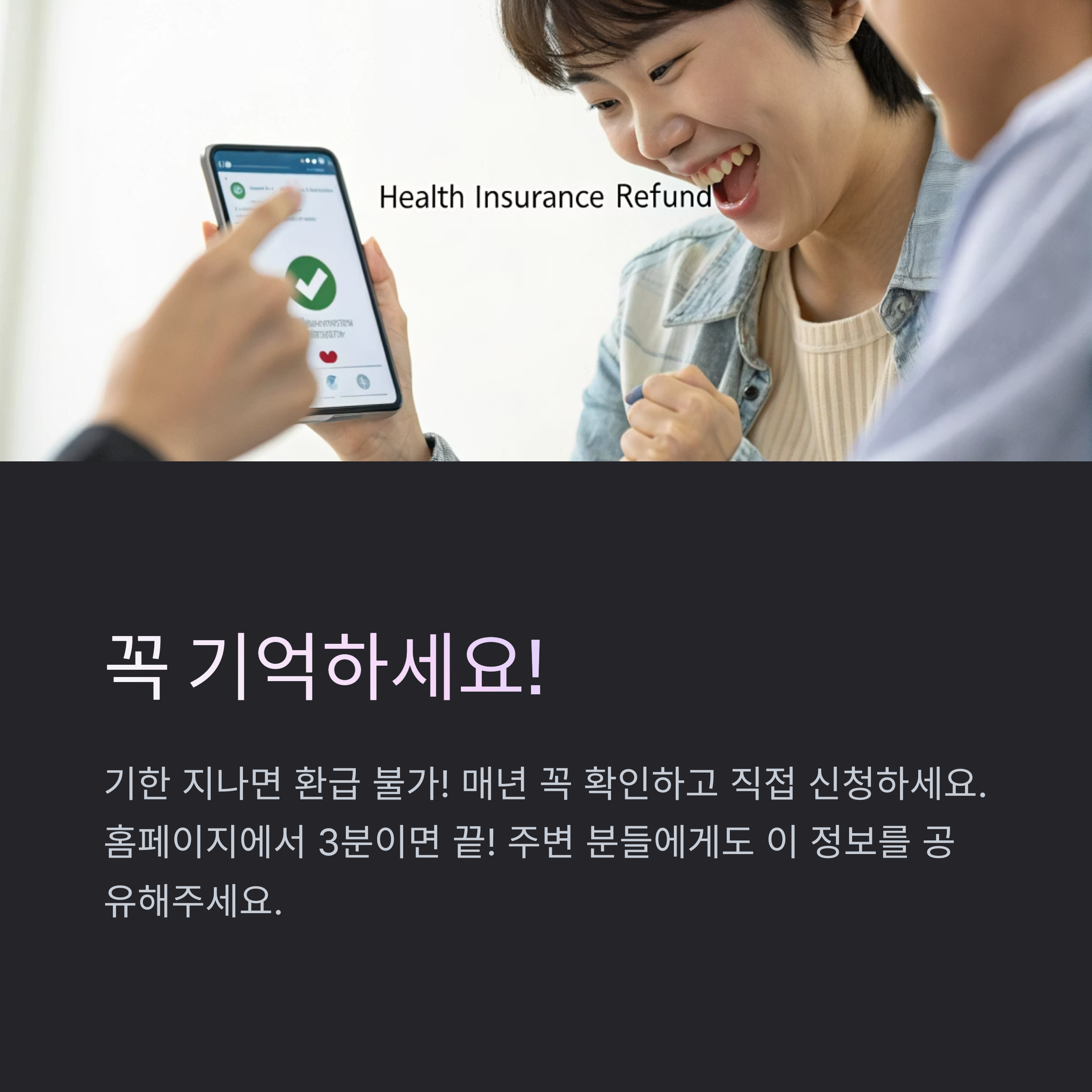 - 사기 문자 주의! 국민건강보험공단은 환급 안내 문자를 보낼 수 있지만, 링크 클릭 전 공식 홈페이지 확인 필수