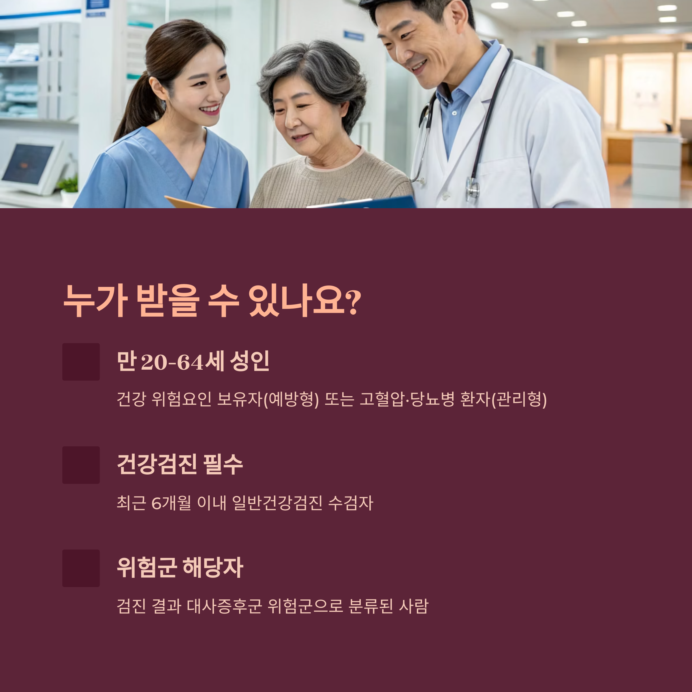 만 20세 이상 성인 중 건강관리가 필요한 대상자라면 신청 자격이 주어집니다