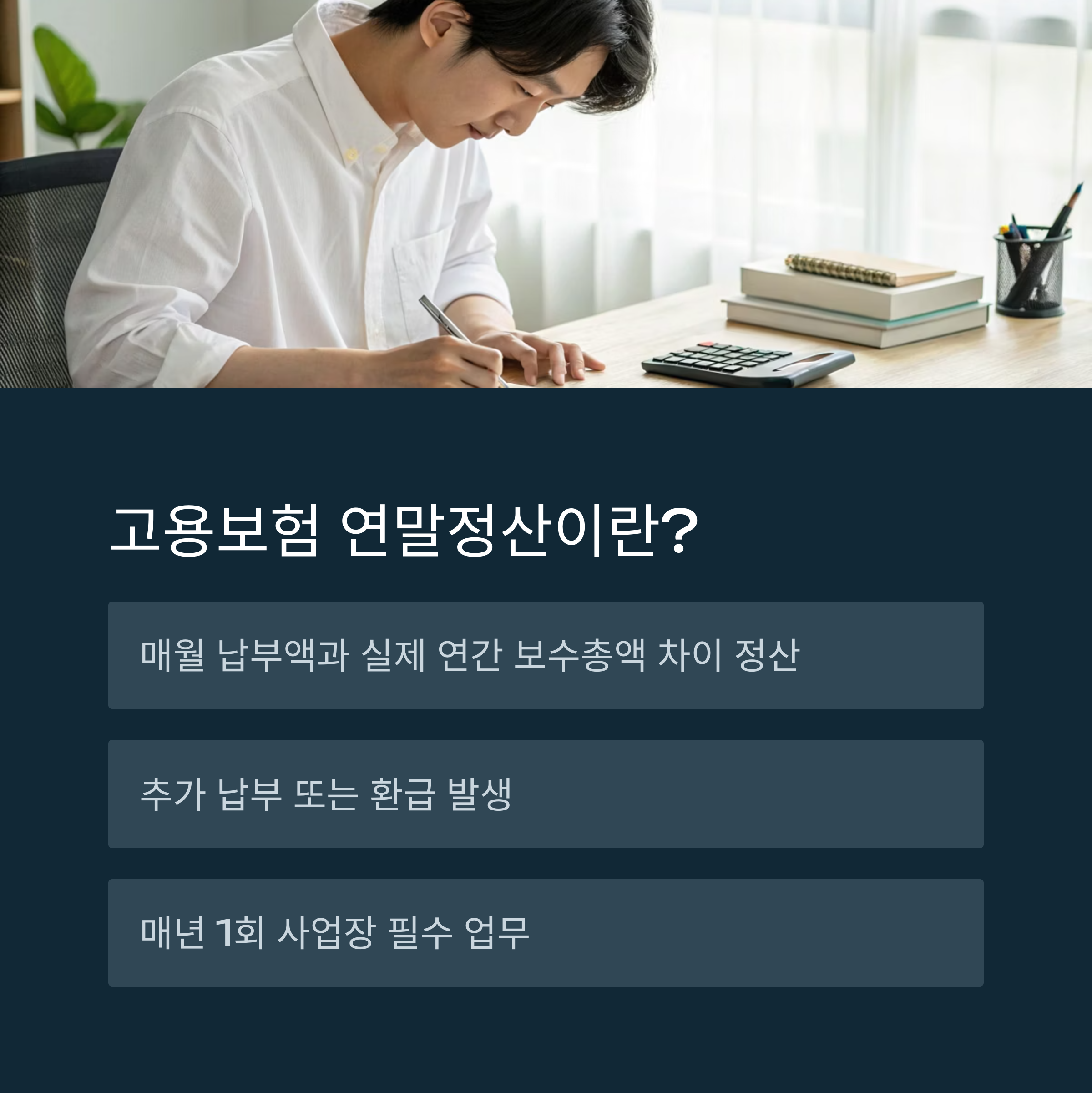 고용보험 연말정산은 사업장에서 1년간 납부한 고용보험료가 실제 근로자의 연간 보수총액 기준과 일치하는지 확인하고, 그 차액을 추가 납부하거나 환급받는 절차입니다.