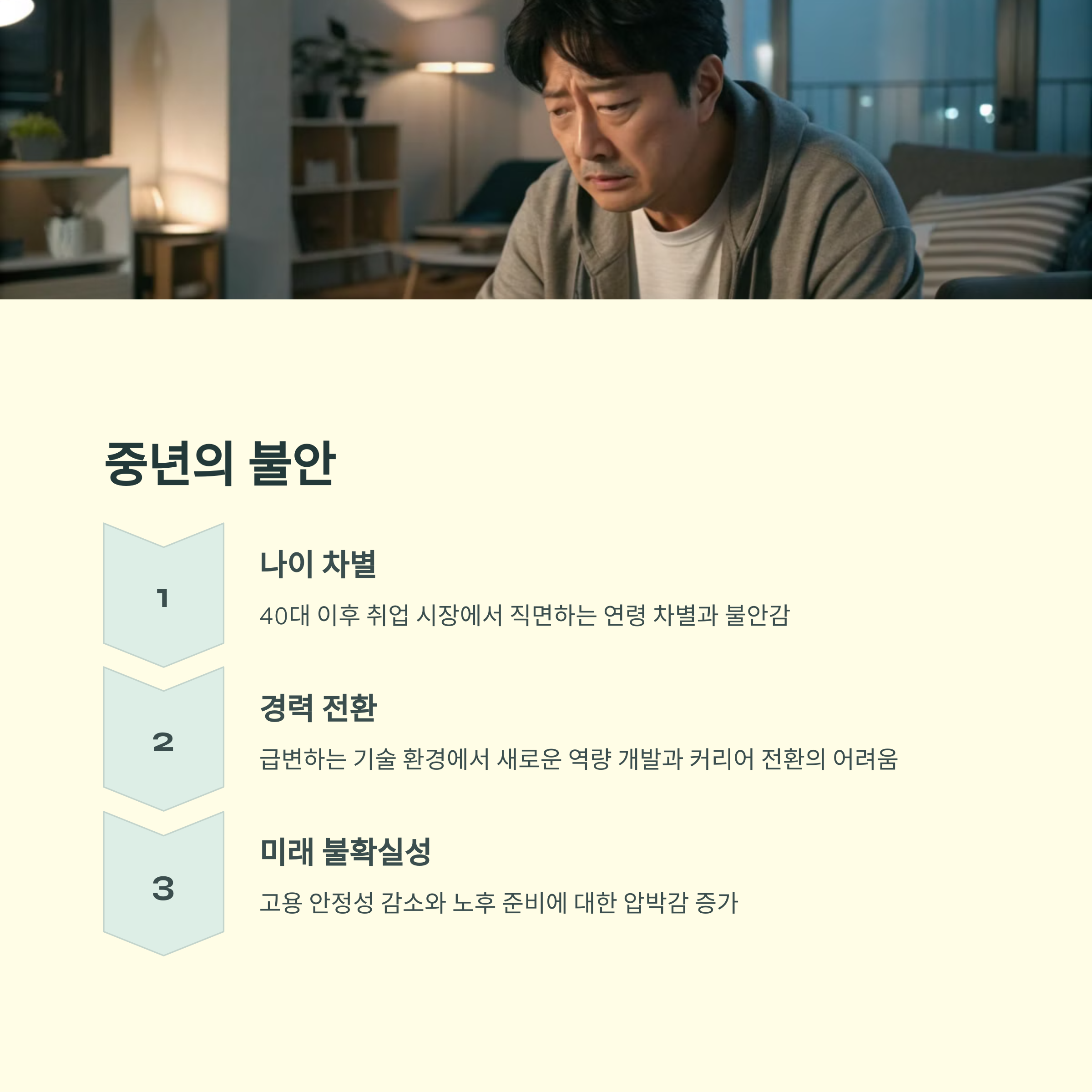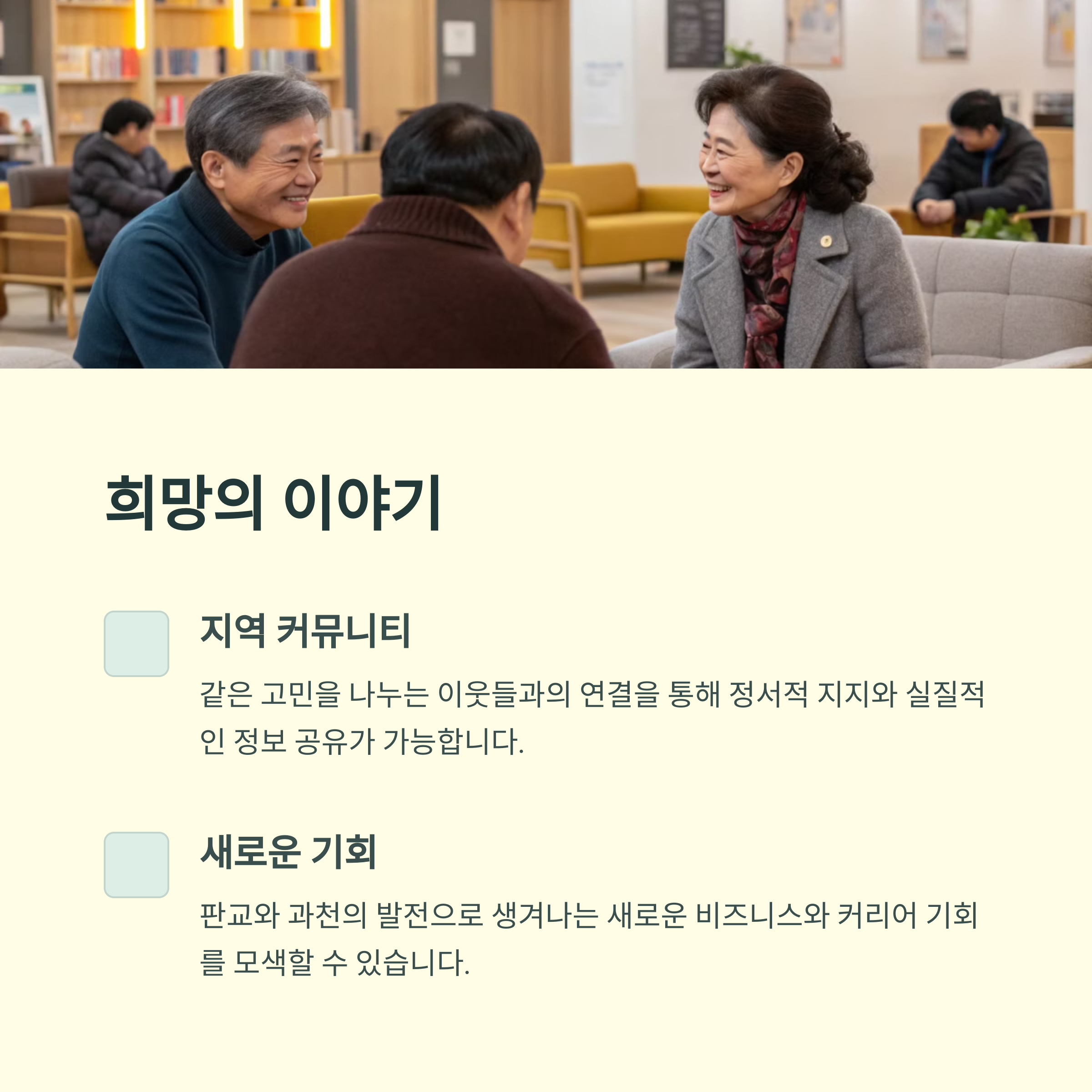 | 입지 좋은 지역이지만 가격 부담이 큽니다. | 워라밸보다 승진과 성과가 중시되는 분위기입니다. | 교육, 부동산, 건강 등 다양한 문제들이 겹칩니다. |