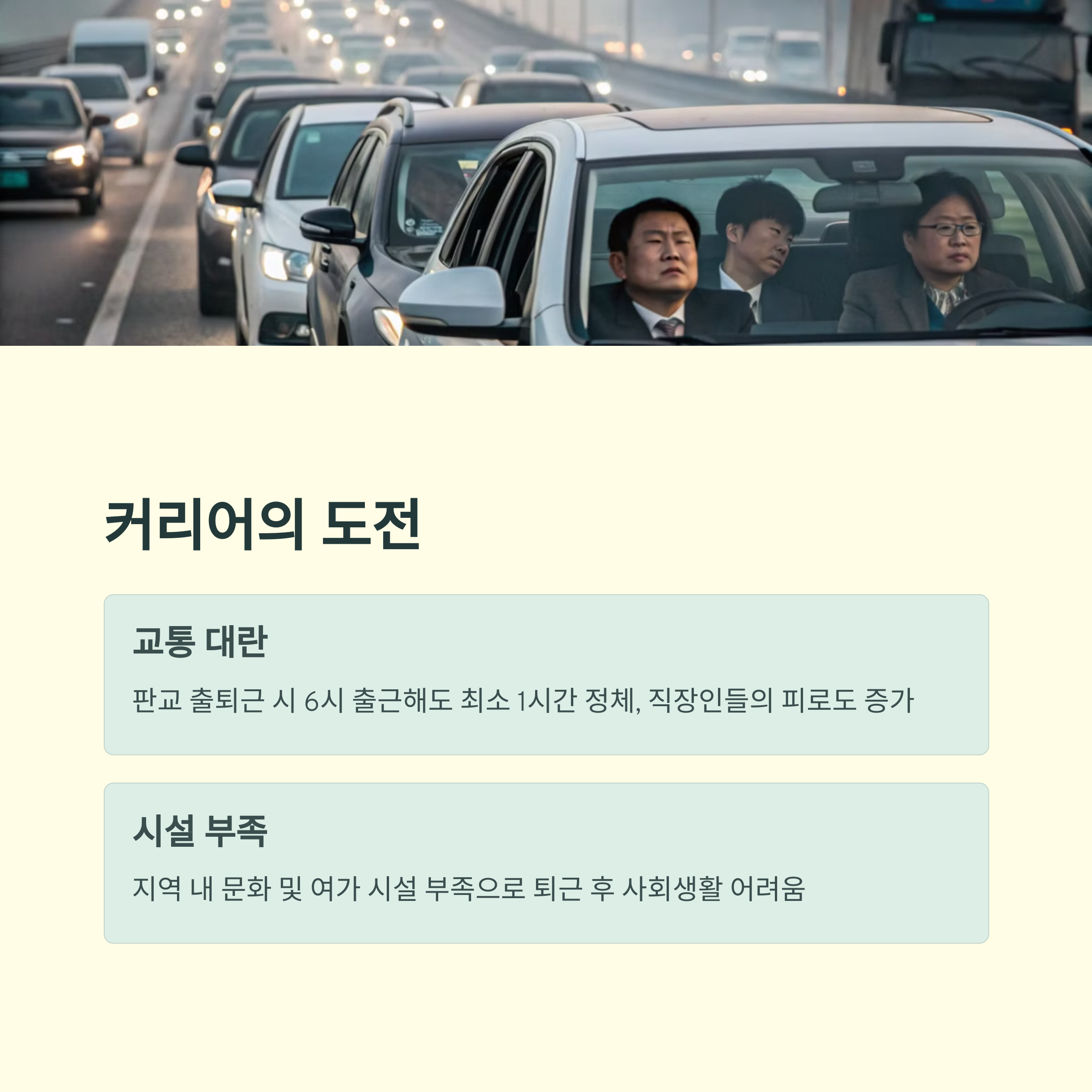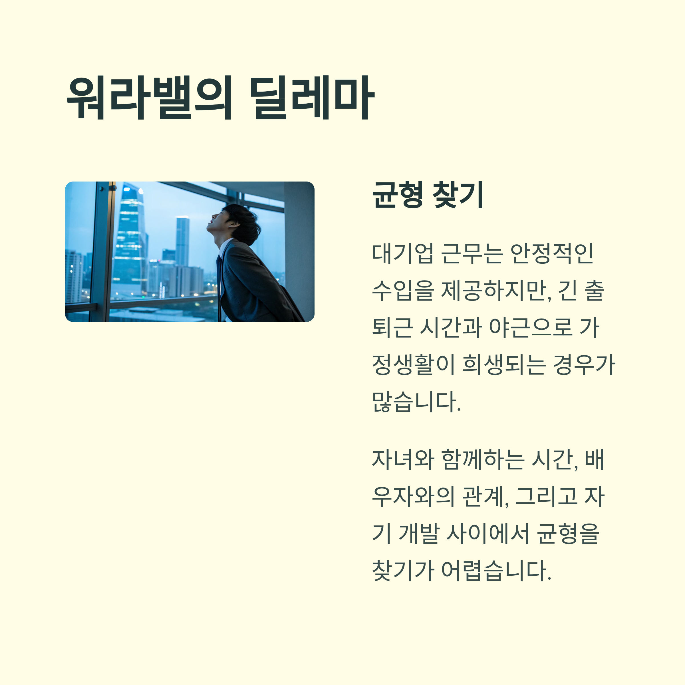 | 판교 직장 문제 | 워라밸과 커리어 성장 사이에서 끊임없이 갈등합니다. |