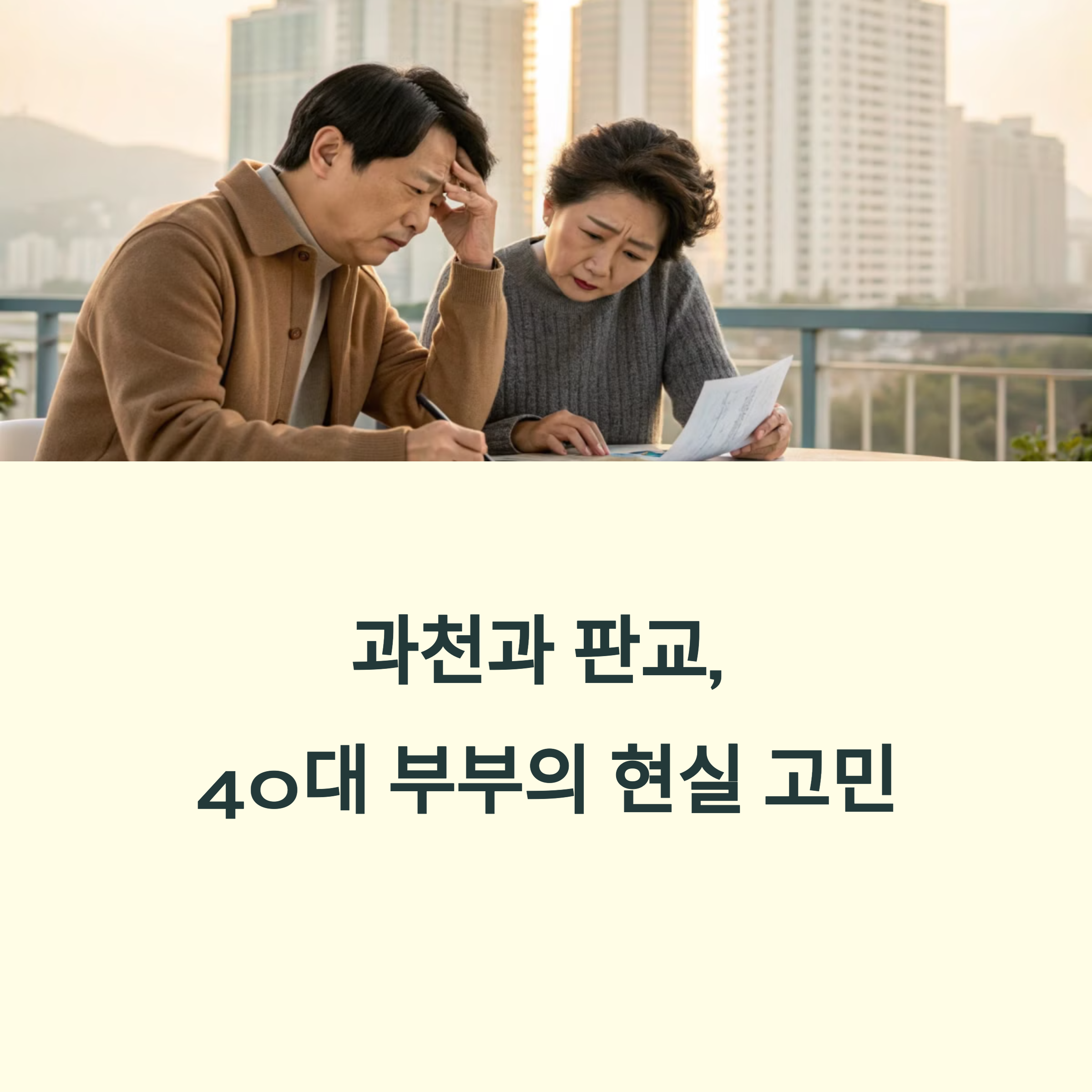 오늘은 과천과 판교에 거주하는 40대 부부의 이야기를 다뤄보려 합니다. 누구나 이상적인 삶을 꿈꾸지만 현실은 그리 녹록치 않죠. 특히나 40대를 지나며 마주하는 인생의 무게는 결코 가볍지 않습니다. 자녀 교육부터 노후 준비, 그리고 부동산의 문제까지, 수많은 선택의 기로에 서 있는 분들을 위해 이 글을 준비했어요. 저 역시도 다양한 상담과 콘텐츠를 통해 이러한 고민을 접해왔기에 실제적인 조언과 현실적인 시선으로 구성했습니다. 함께 고민하고, 해답을 모색하는 시간이 되길 바라며 글을 시작해볼게요.