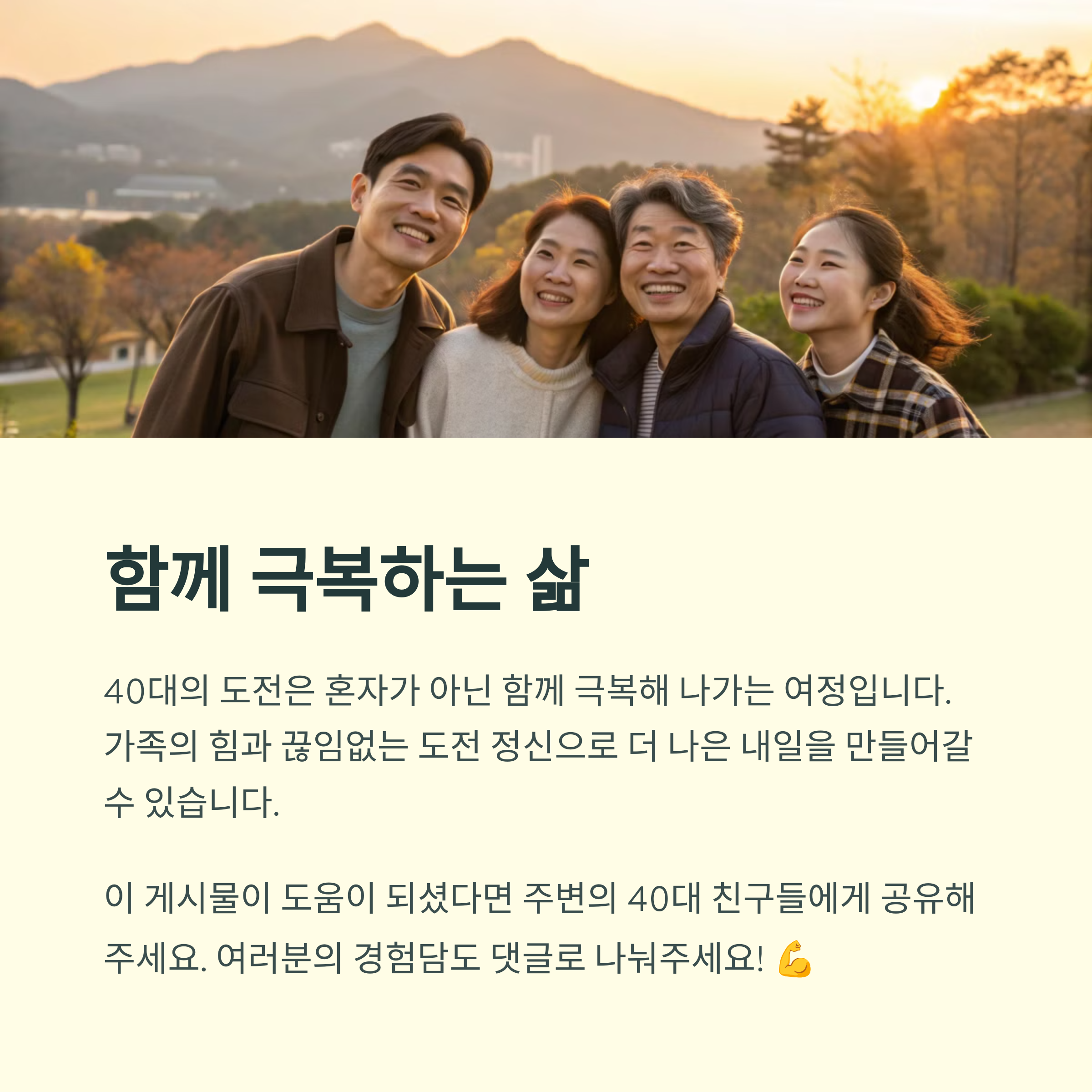 과천, 판교 혹은 40대 삶에 대해 여러분은 어떤 생각을 갖고 계신가요? 댓글로 나눠주시거나, 비슷한 고민이 있는 분들과 이 글을 공유해 보세요. 함께 이야기 나누는 것이 더 나은 삶의 시작이 될 수 있습니다.