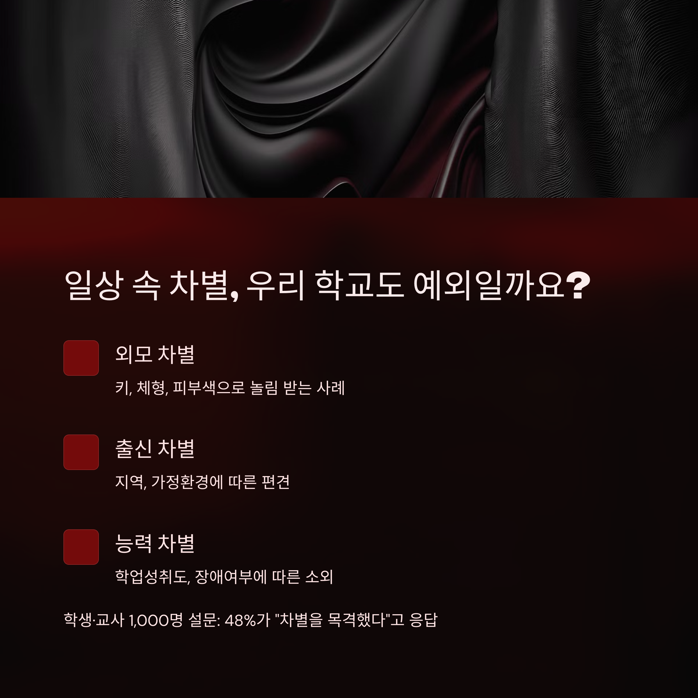 안녕하세요 여러분! 혹시 학교에서 누군가가 외모, 출신, 장애, 성별 등으로 인해 차별받는 모습을 본 적 있으신가요?