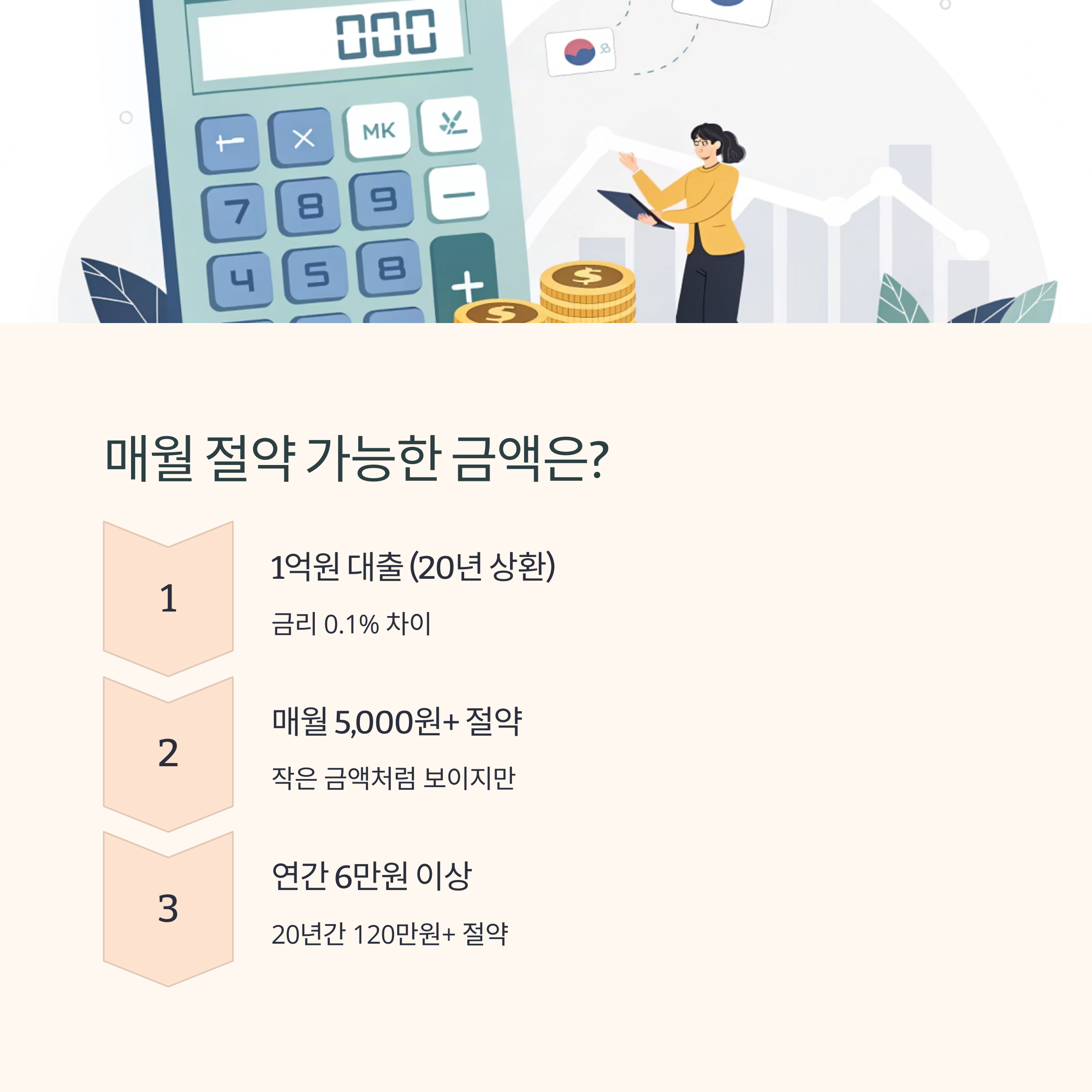 많은 분들이 금리 0.1% 차이를 대수롭지 않게 생각하지만, 대출금액이 커질수록 이 차이는 실제 생활에 영향을 줄 정도로 커집니다. 온라인 비교 플랫폼이나 금융 앱을 활용해 꼭 여러 금융사의 조건을 살펴보시고, 연간 이자 부담을 줄여보세요.
