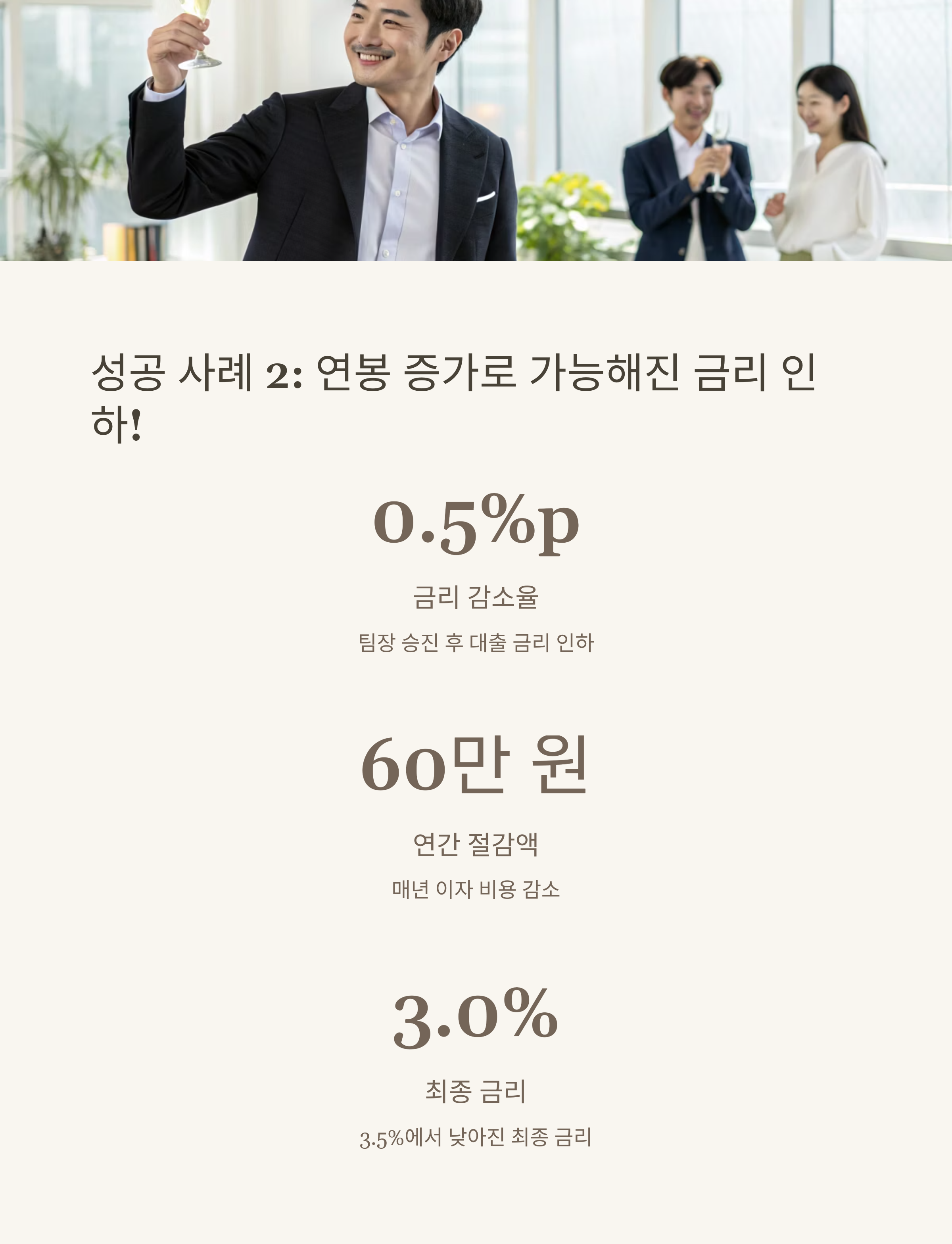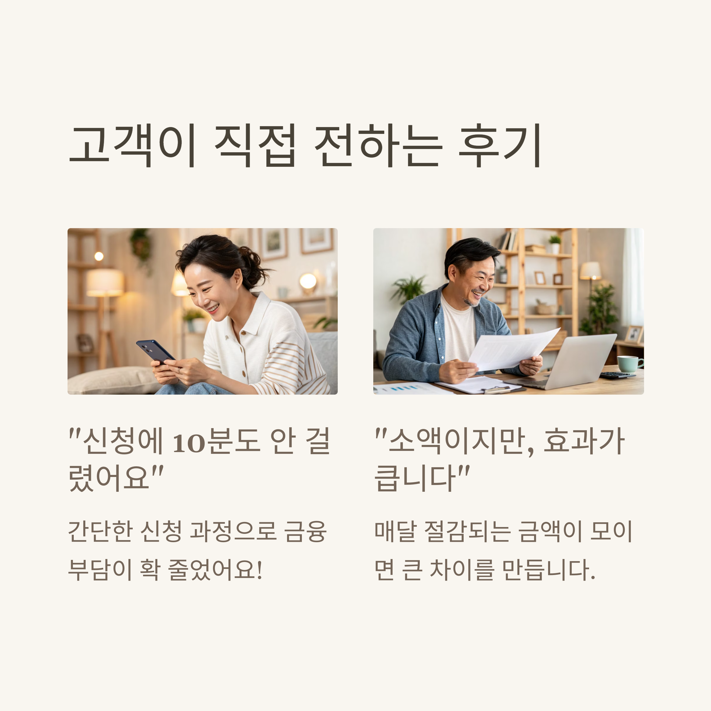“금리 인하로 숨통이 트였어요. 이제는 미래를 위한 저축까지 가능해졌습니다.” – 실제 후기 중에서