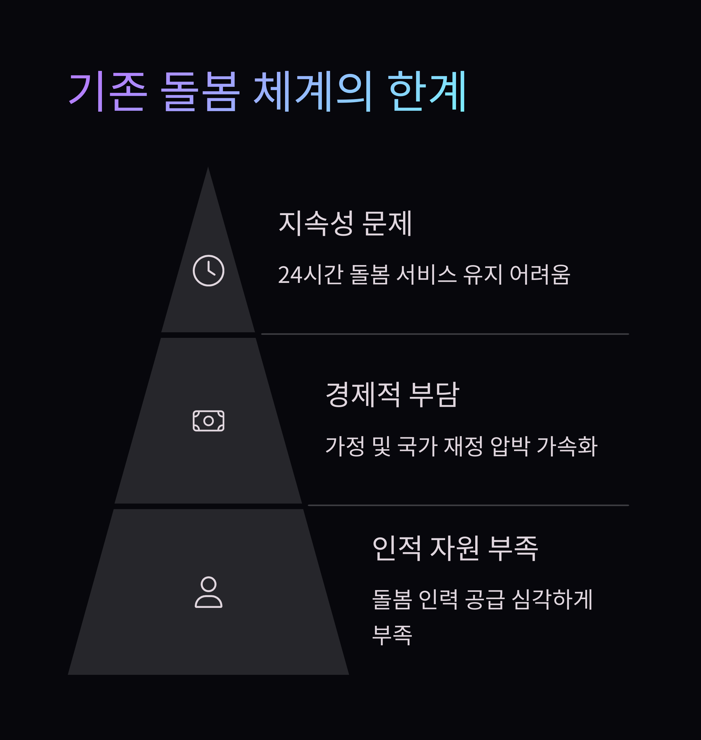 - 기존 돌봄 체계의 한계: 인력, 비용, 지속성 모두 위기