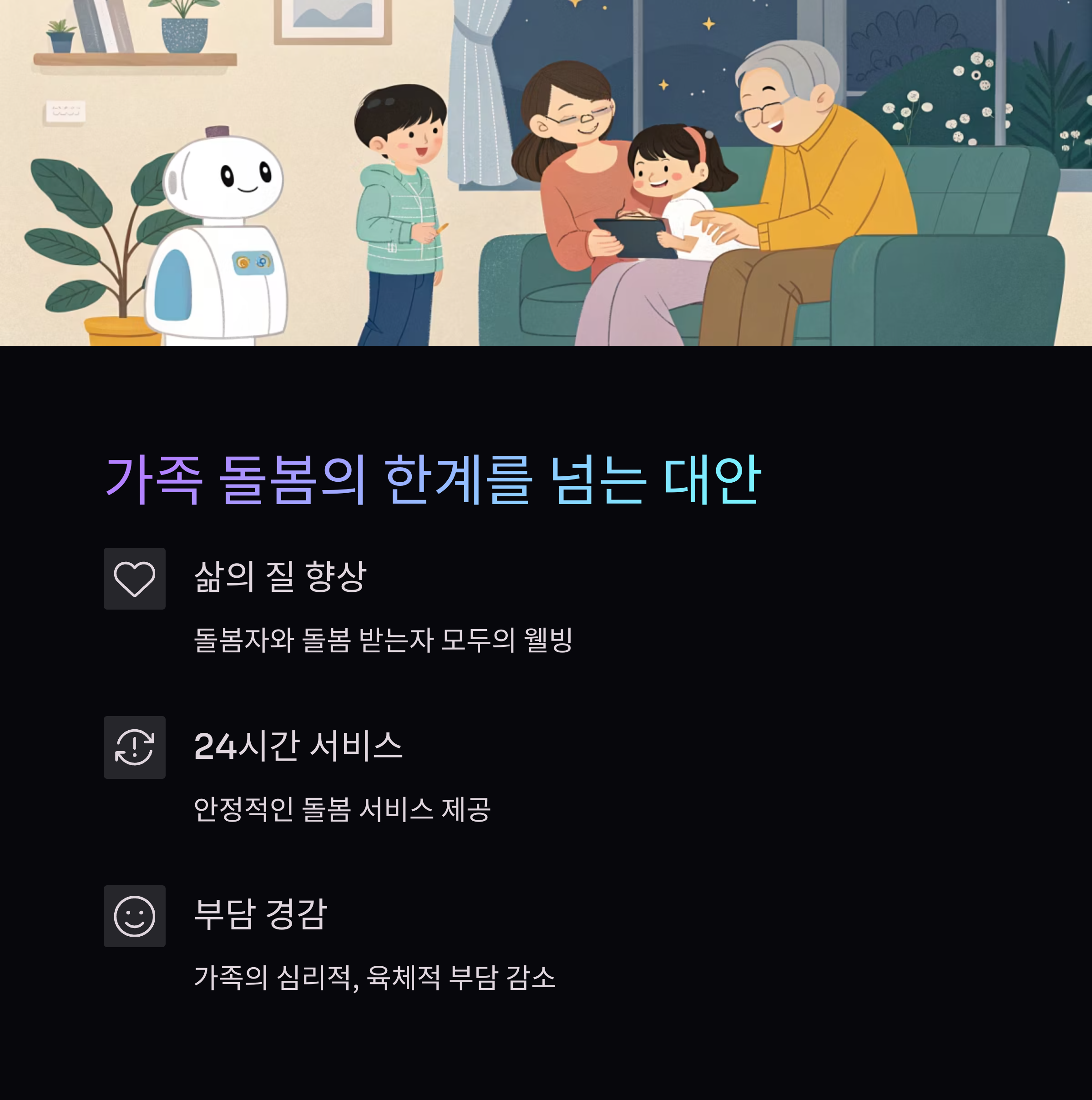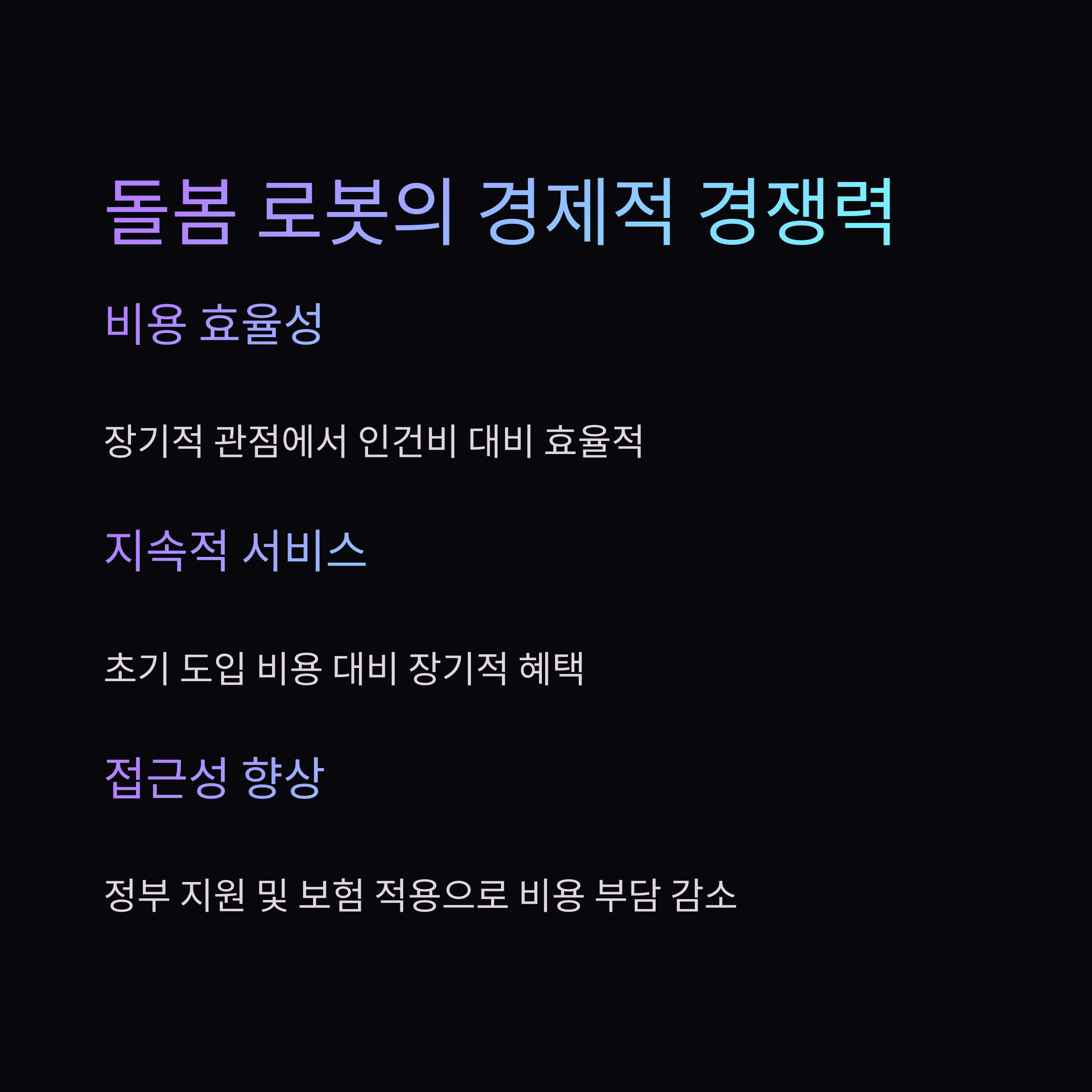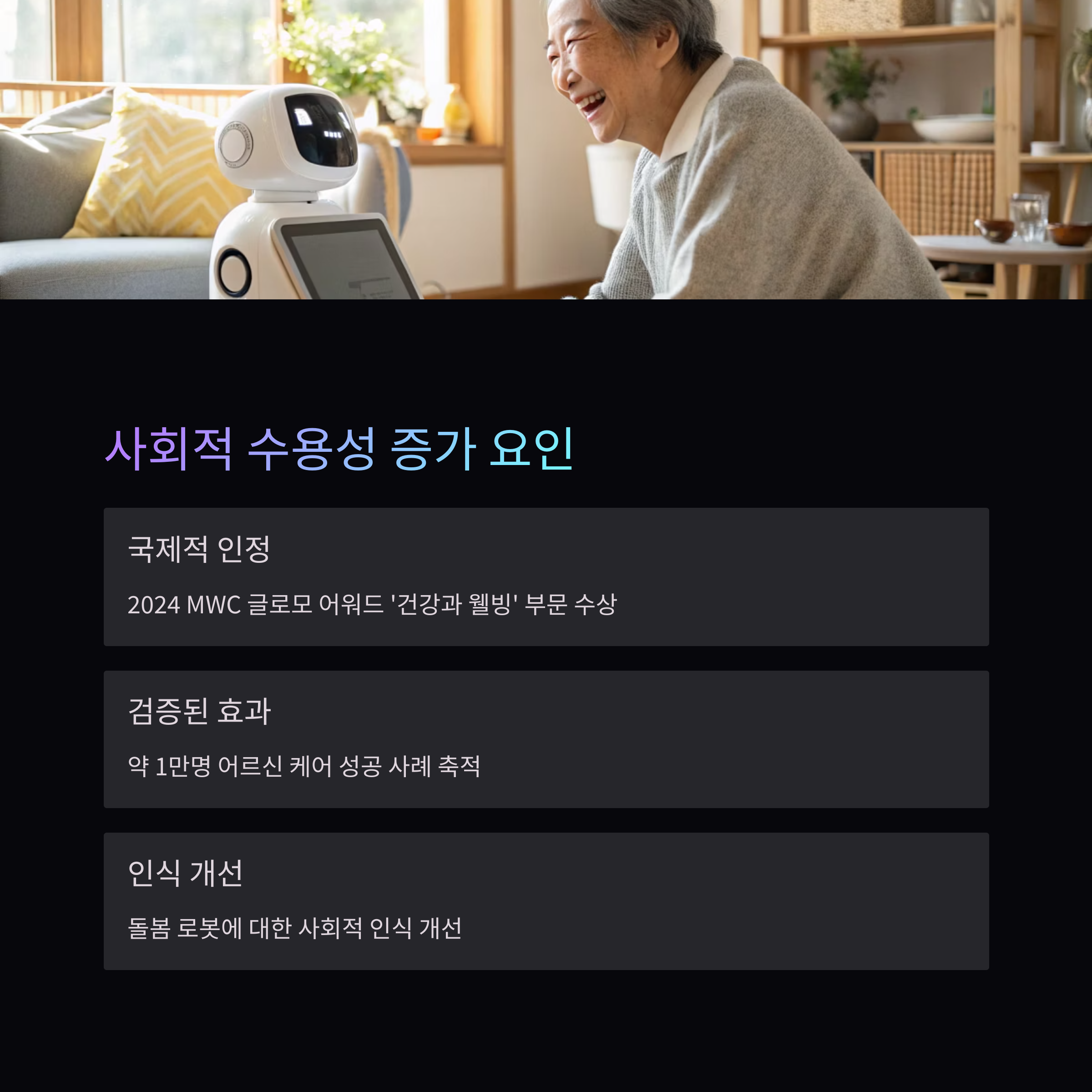 | 긴급상황 대응력 | 완전한 응급 대응은 불가능 | 로봇 + 방문 인력 병합 ‘하이브리드 케어’ 모델 정립 |