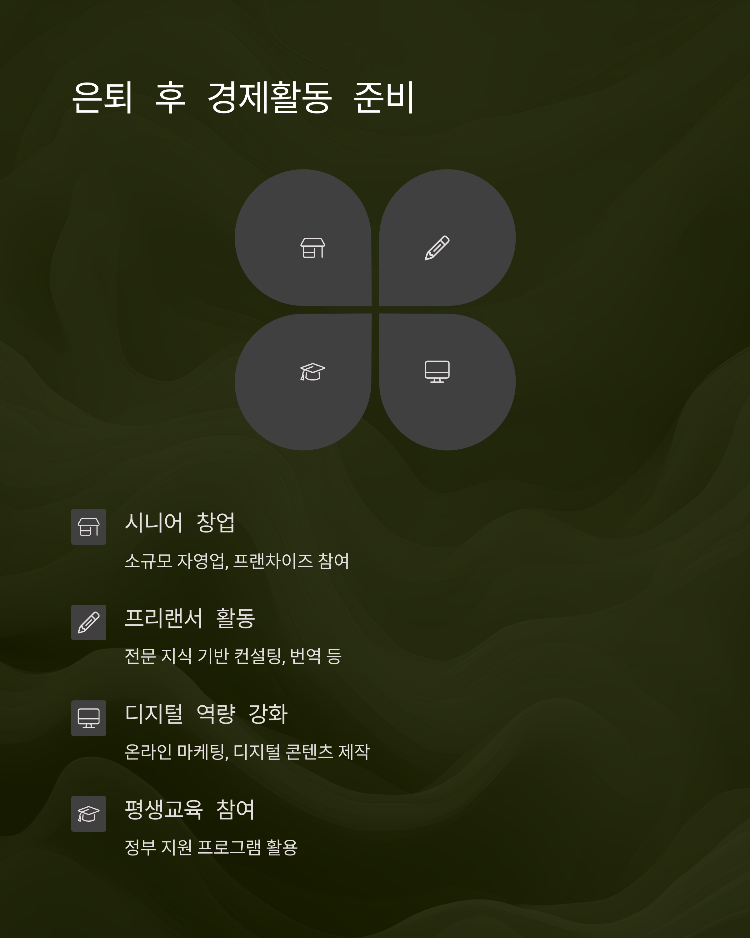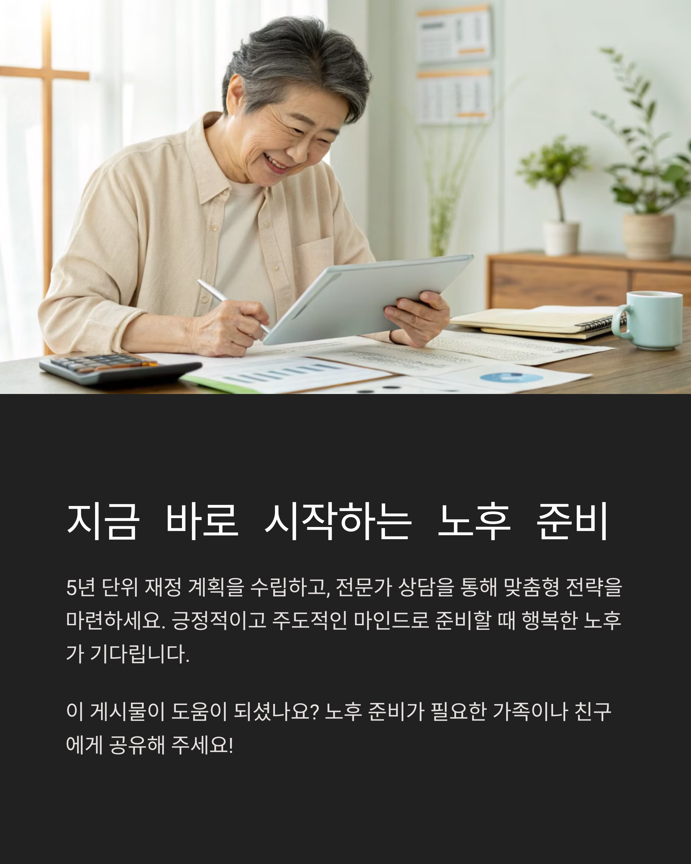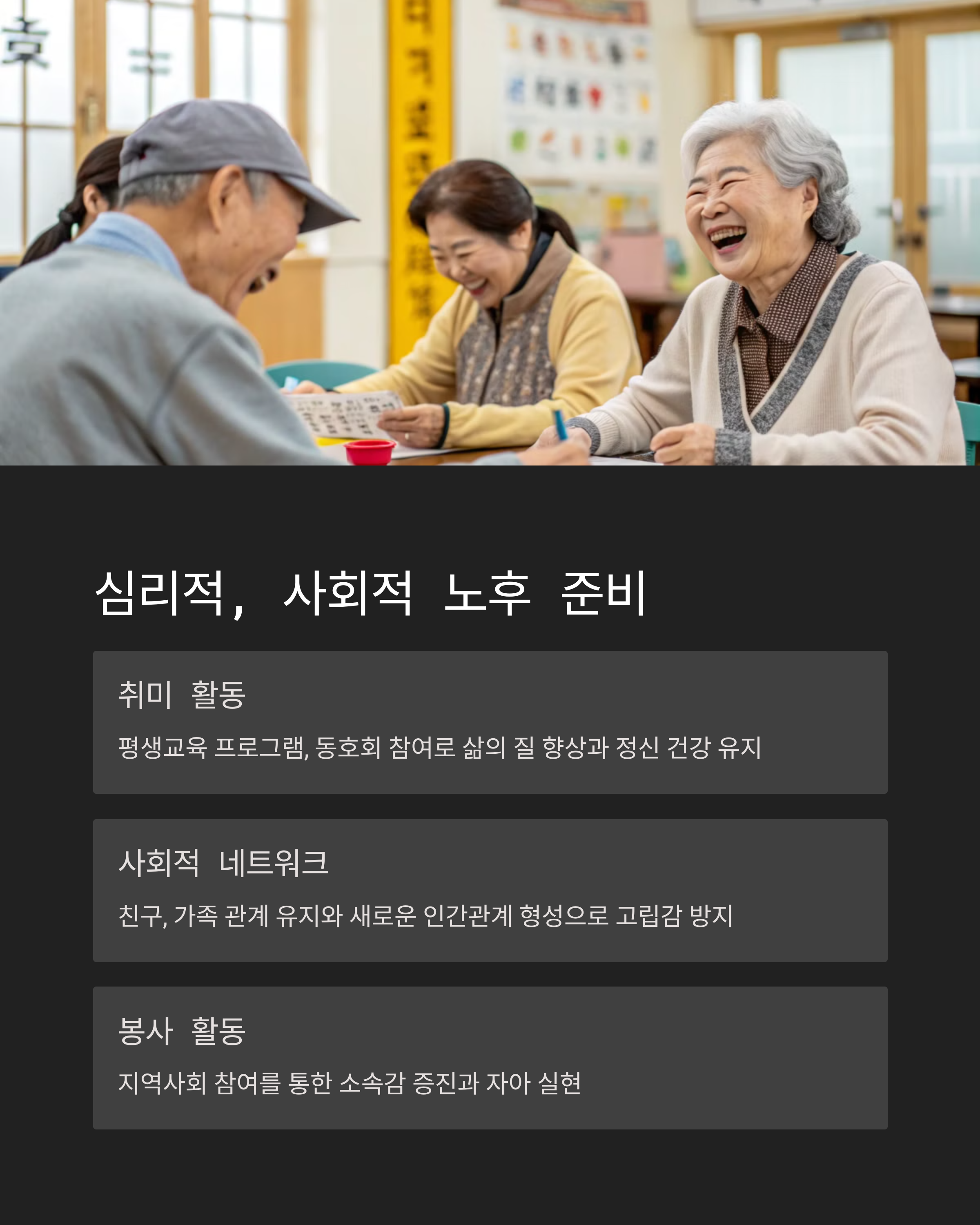 | 연금, 자산관리, 생활비 예측이 핵심입니다. | 운동, 식습관, 정기 검진이 예방의 핵심입니다. | 취미, 봉사, 자기계발로 삶의 의미를 찾습니다. |