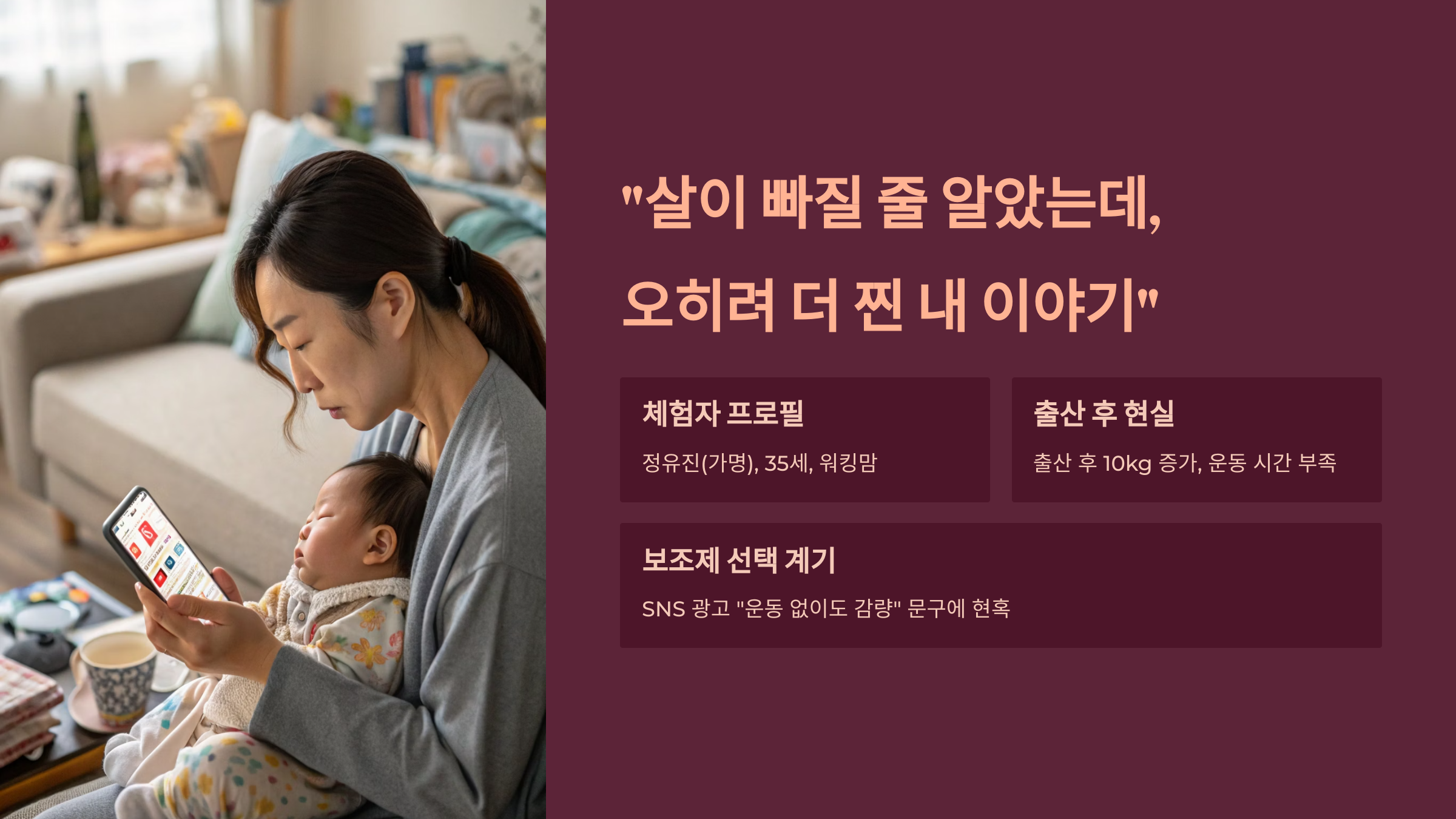 “아이 낳고 10kg이 늘어난 몸을 보며, 도저히 운동할 시간은 없고… SNS에서 본 보조제가 눈에 들어왔어요.