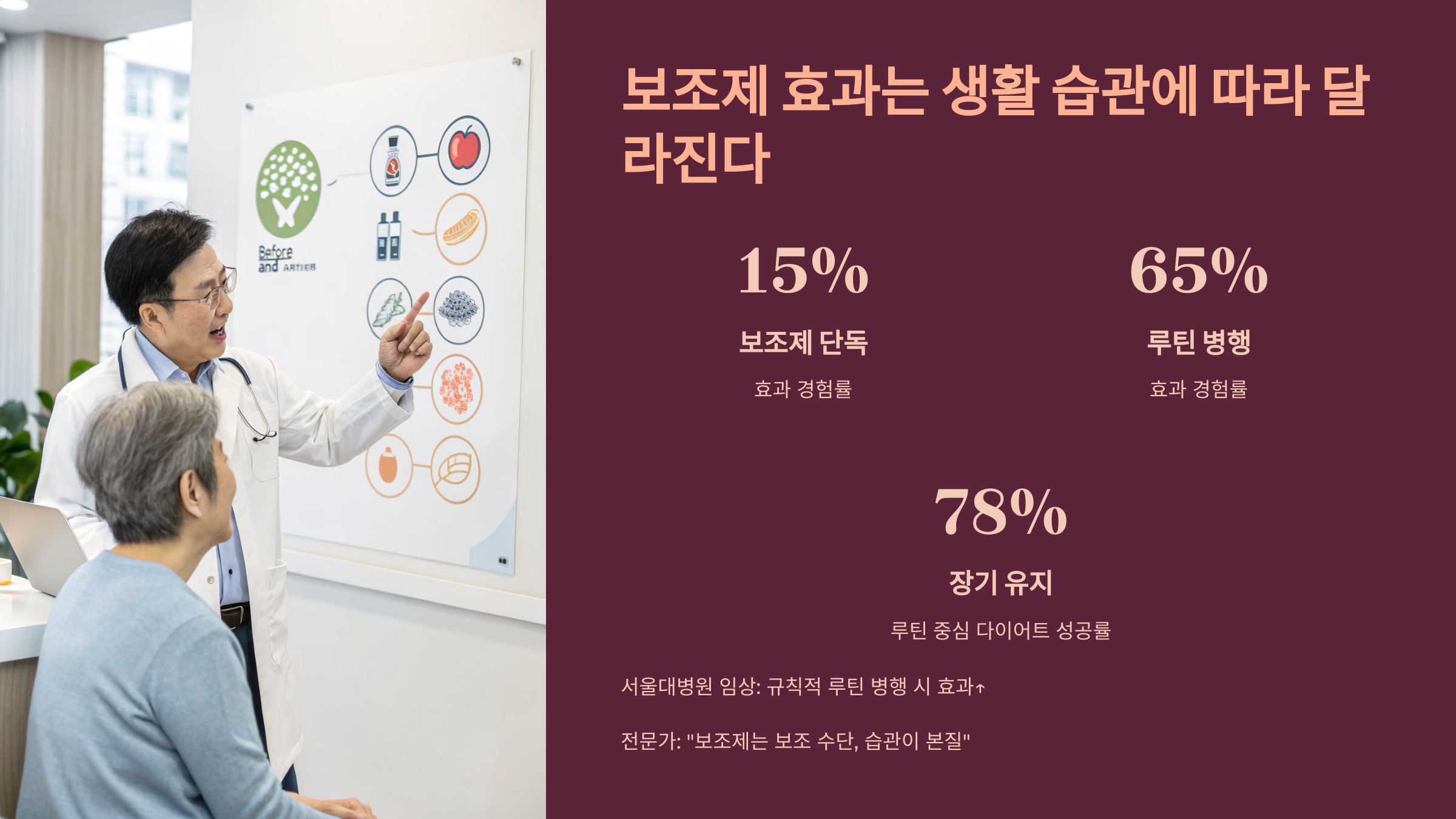“보조제는 마치 돋보기 같은 존재예요. 햇볕(운동, 식단)이 없으면 아무 효과도 없습니다.”