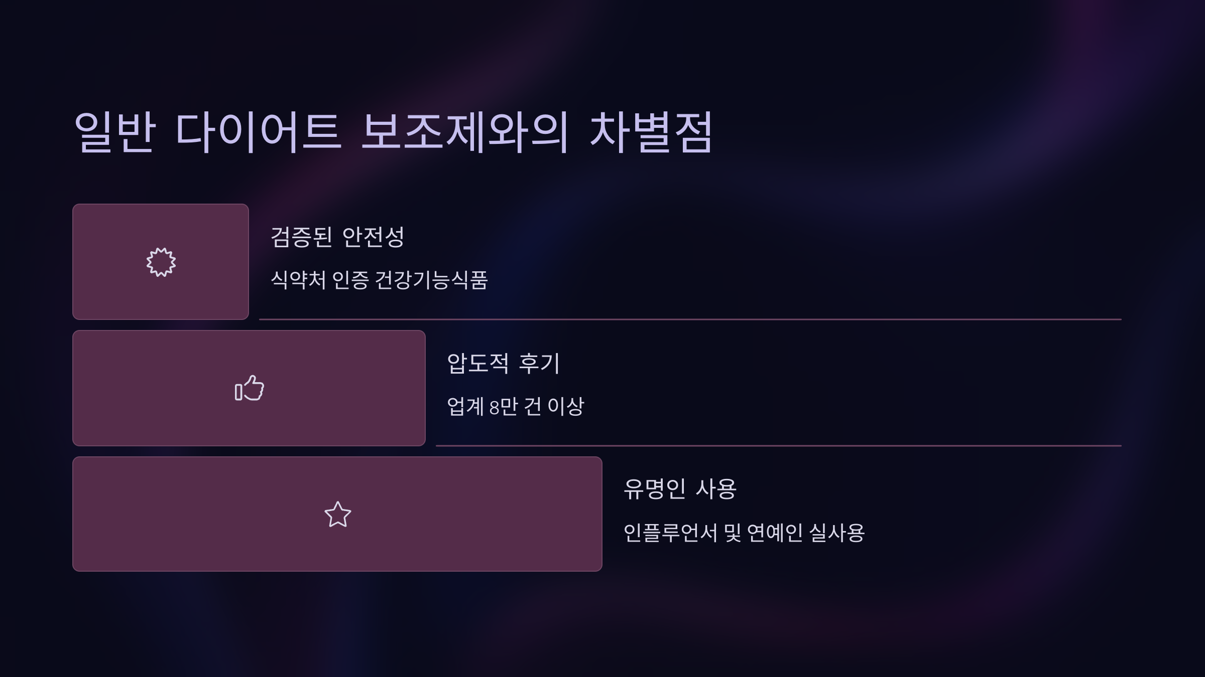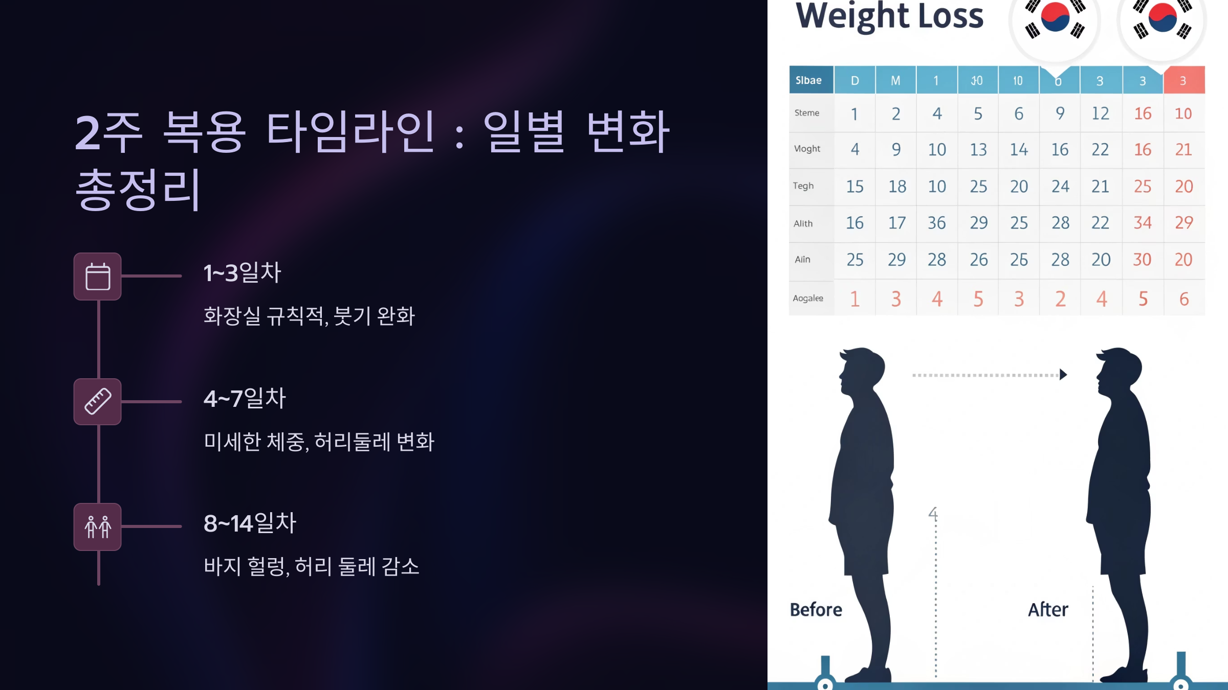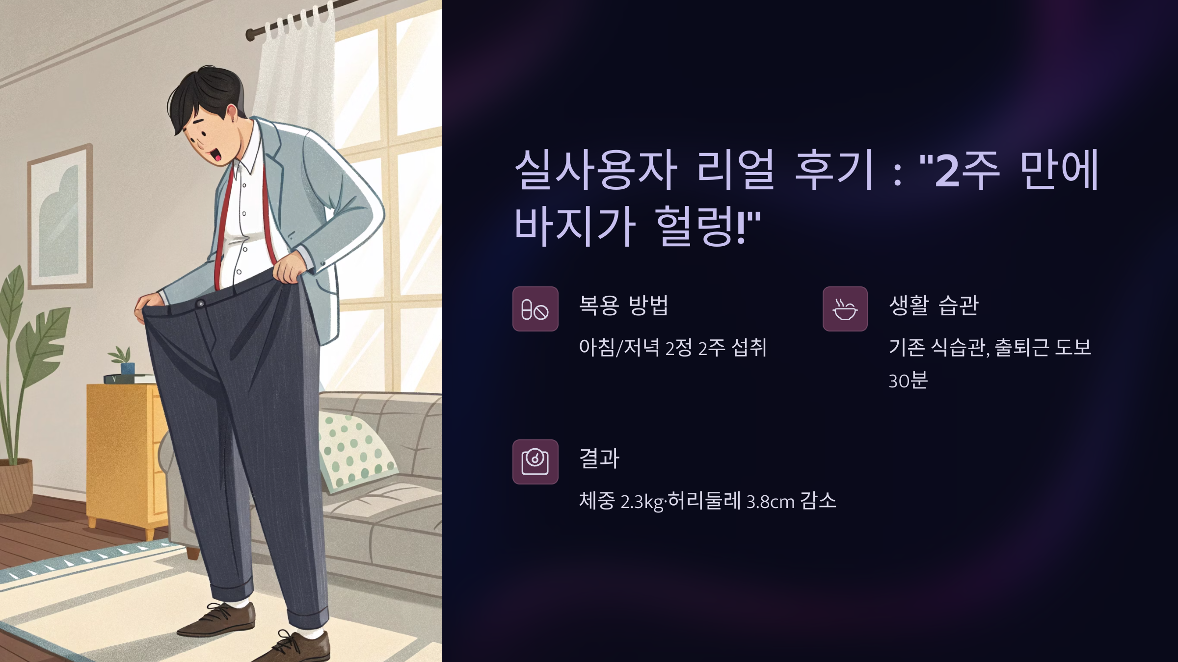 - 효과: 평균 2주 내 체중 2kg, 복부 둘레 약 3cm 감소