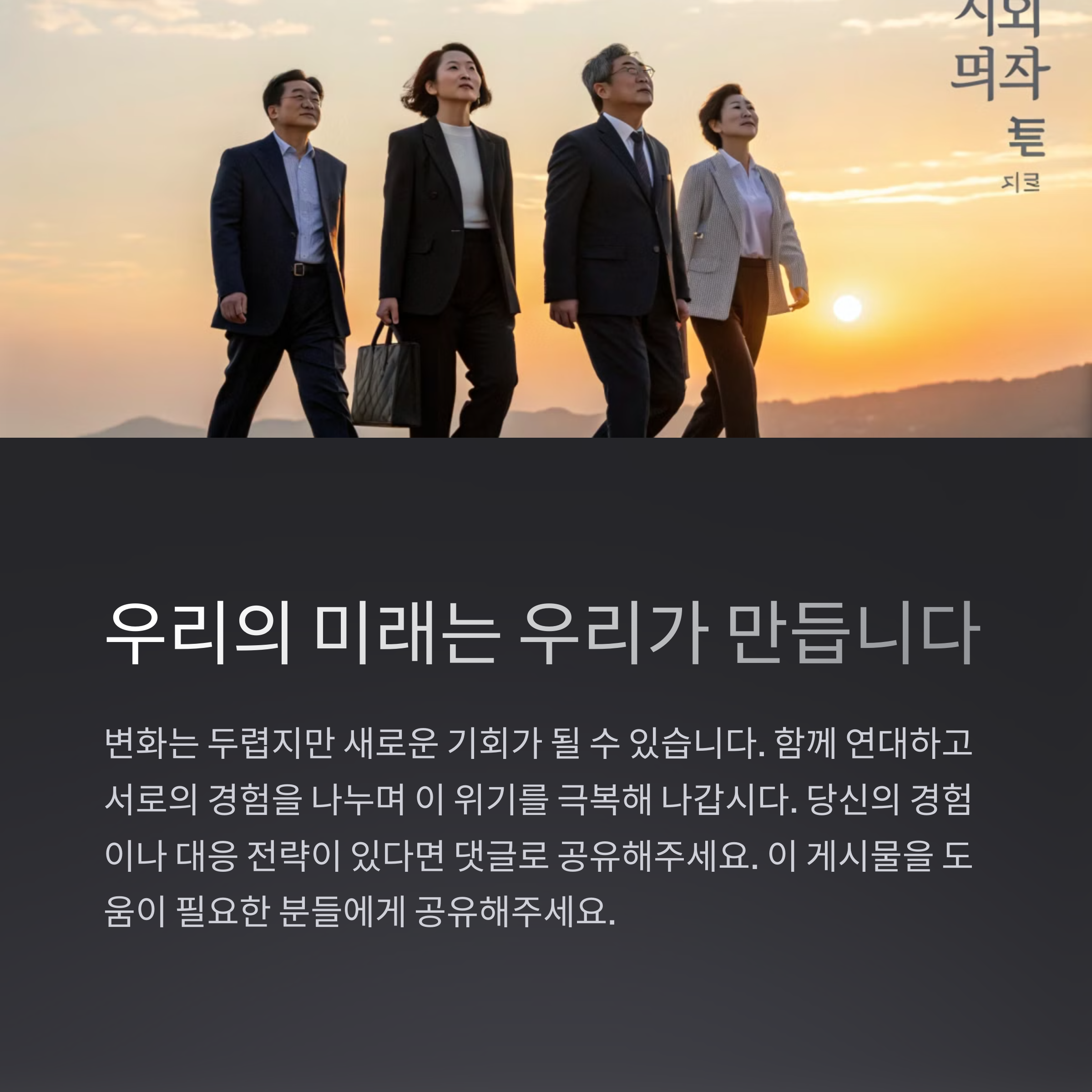 중장년층 구조조정에 대한 여러분의 생각은 어떠신가요? 댓글을 통해 다양한 시각을 공유해 주시면 감사하겠습니다. 이 주제에 대해 더 많은 분들과 함께 고민해보고 싶습니다.