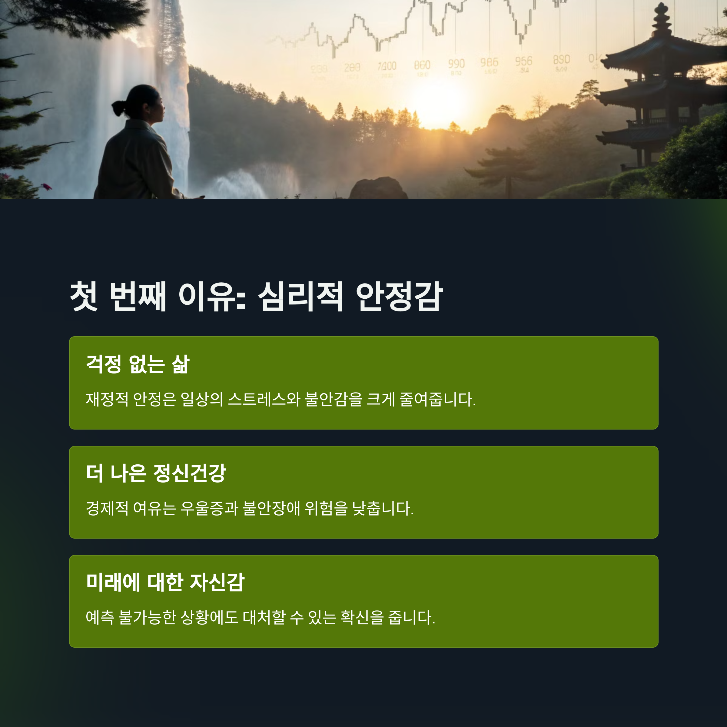 | 심리적 안정감 | 돈이 있으면 불안감이 줄고 마음의 여유가 생깁니다. |