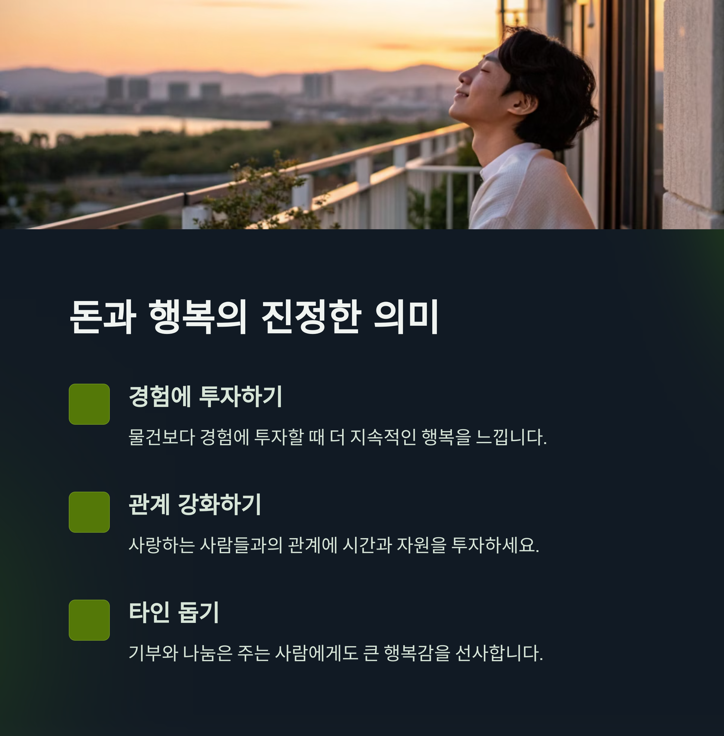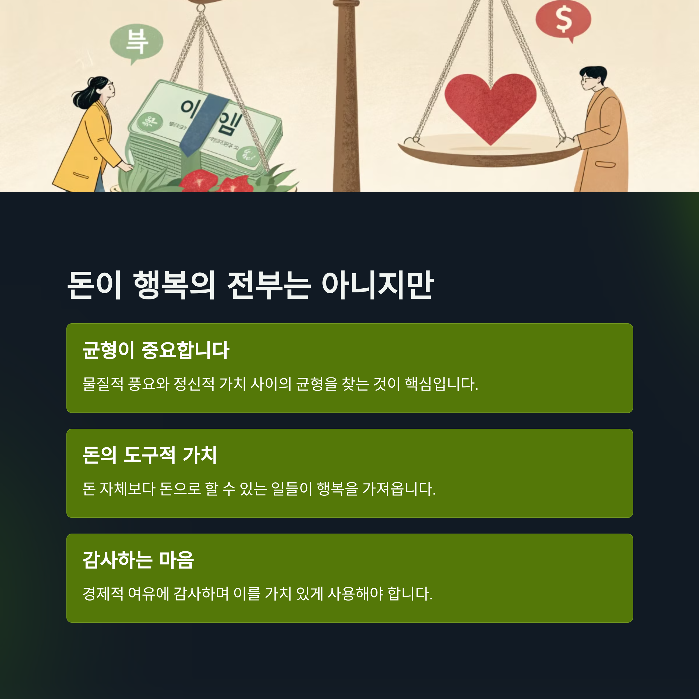 돈이 주는 행복에 대해 어떻게 생각하시나요? 공감되었던 부분이나 자신의 경험을 댓글로 나눠주시면 더 풍부한 이야기를 함께 나눌 수 있습니다.