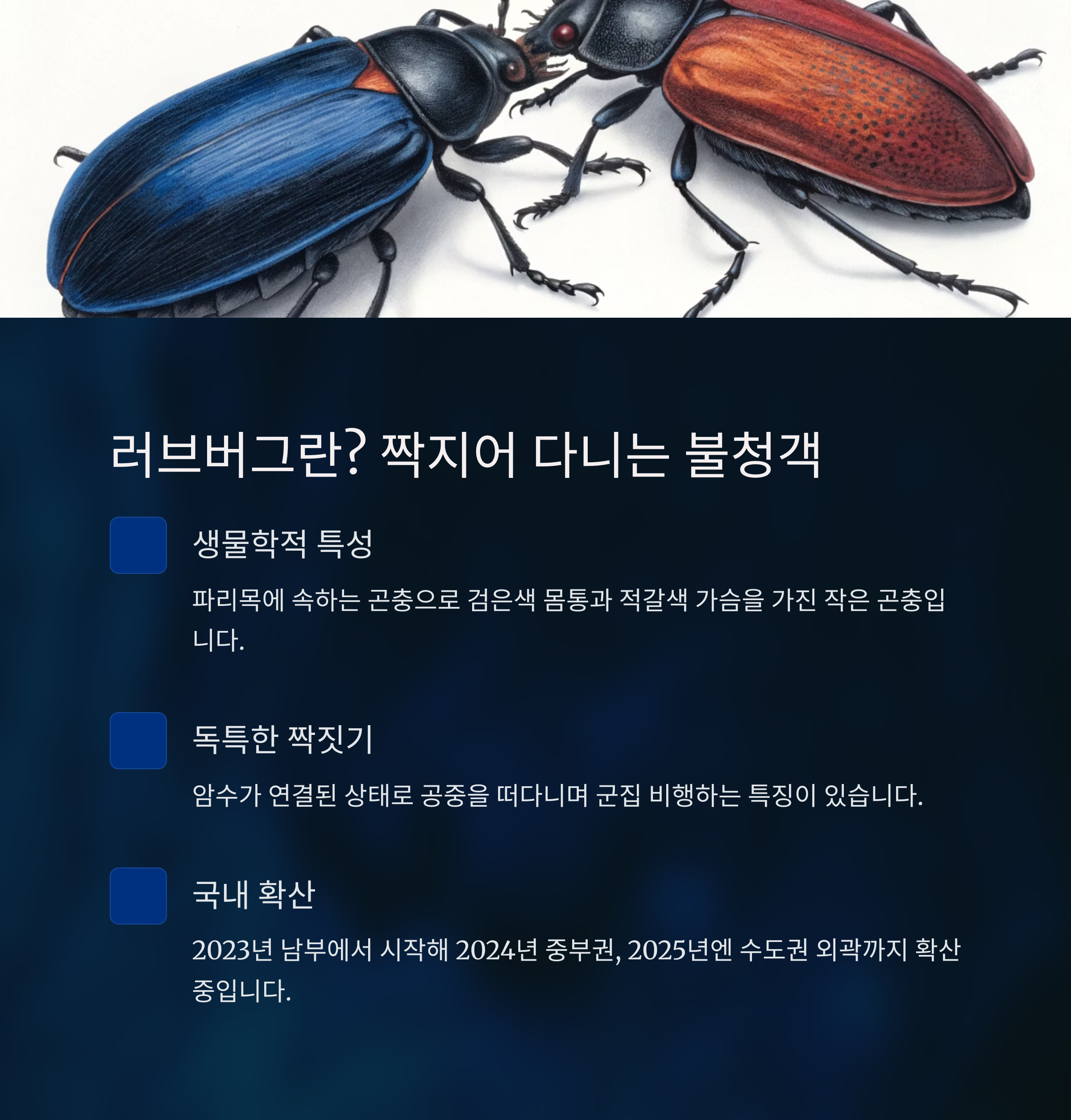 이번 글에서는 러브버그의 생물학적 특성부터, 지역별 출몰 양상, 생활 속 피해 사례, 예방법, 그리고 전국 지자체의