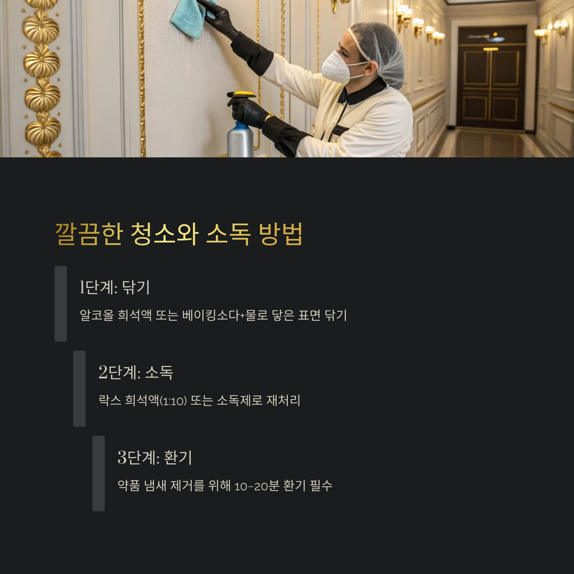 | 2단계: 소독 | 락스 희석액(1:10) 또는 소독제 스프레이로 닦은 부위 재처리, 물걸레질로 마무리 |