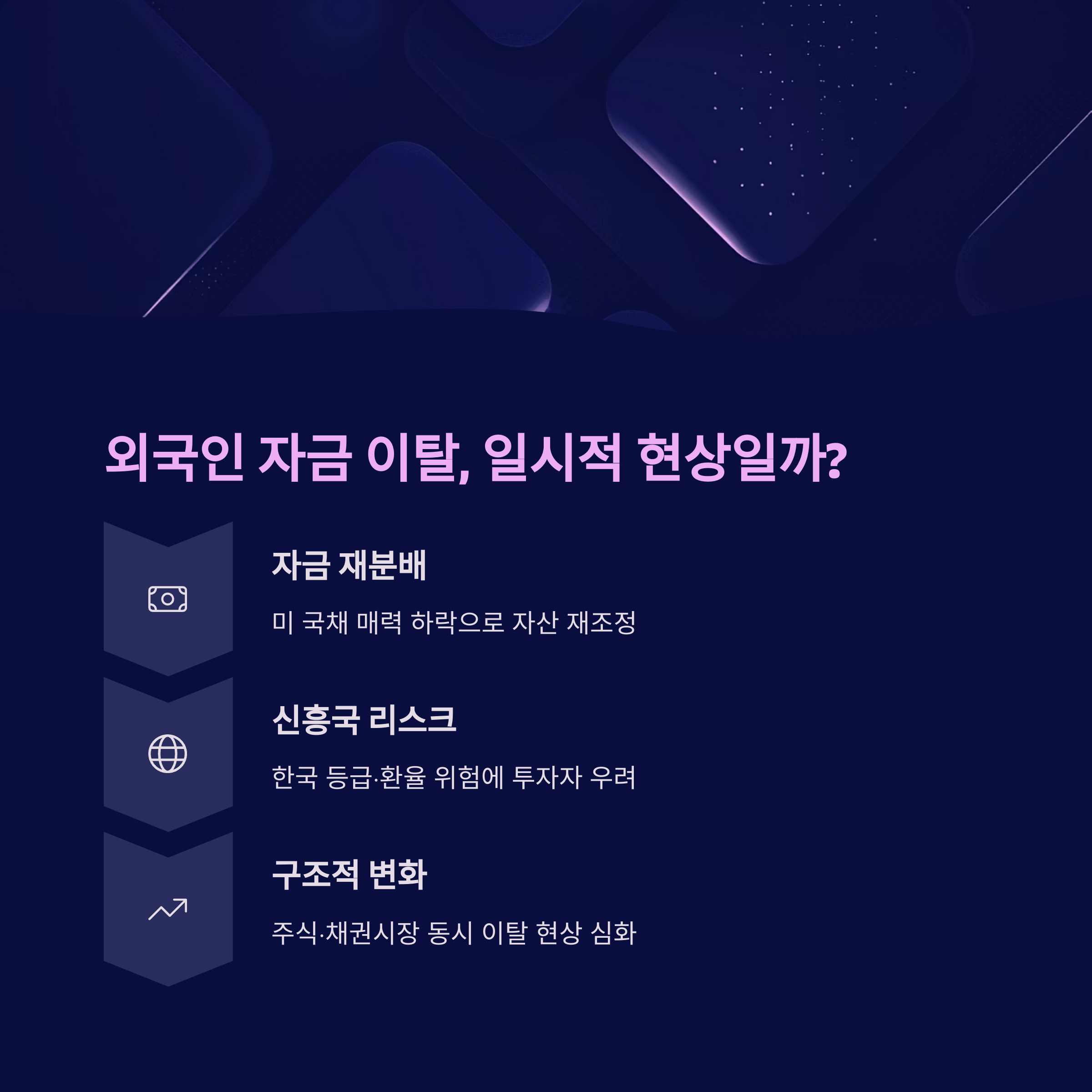 - 달러 강세 전환 → 원화 약세 → 외국인 자금 이탈
