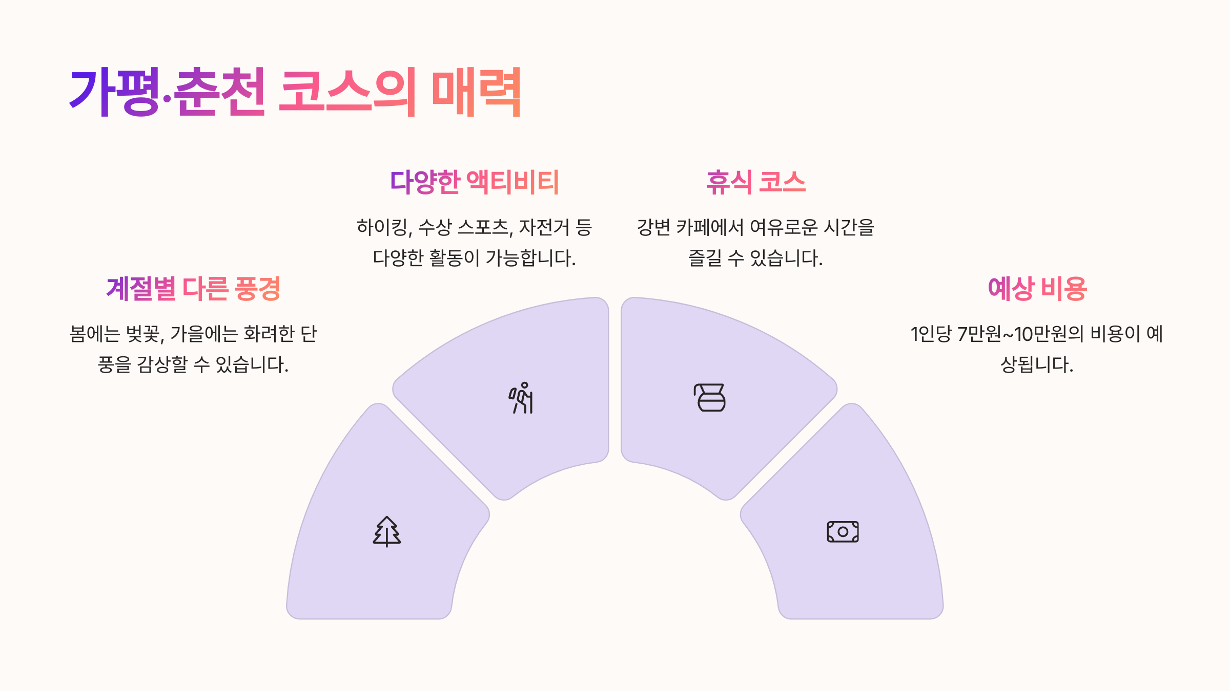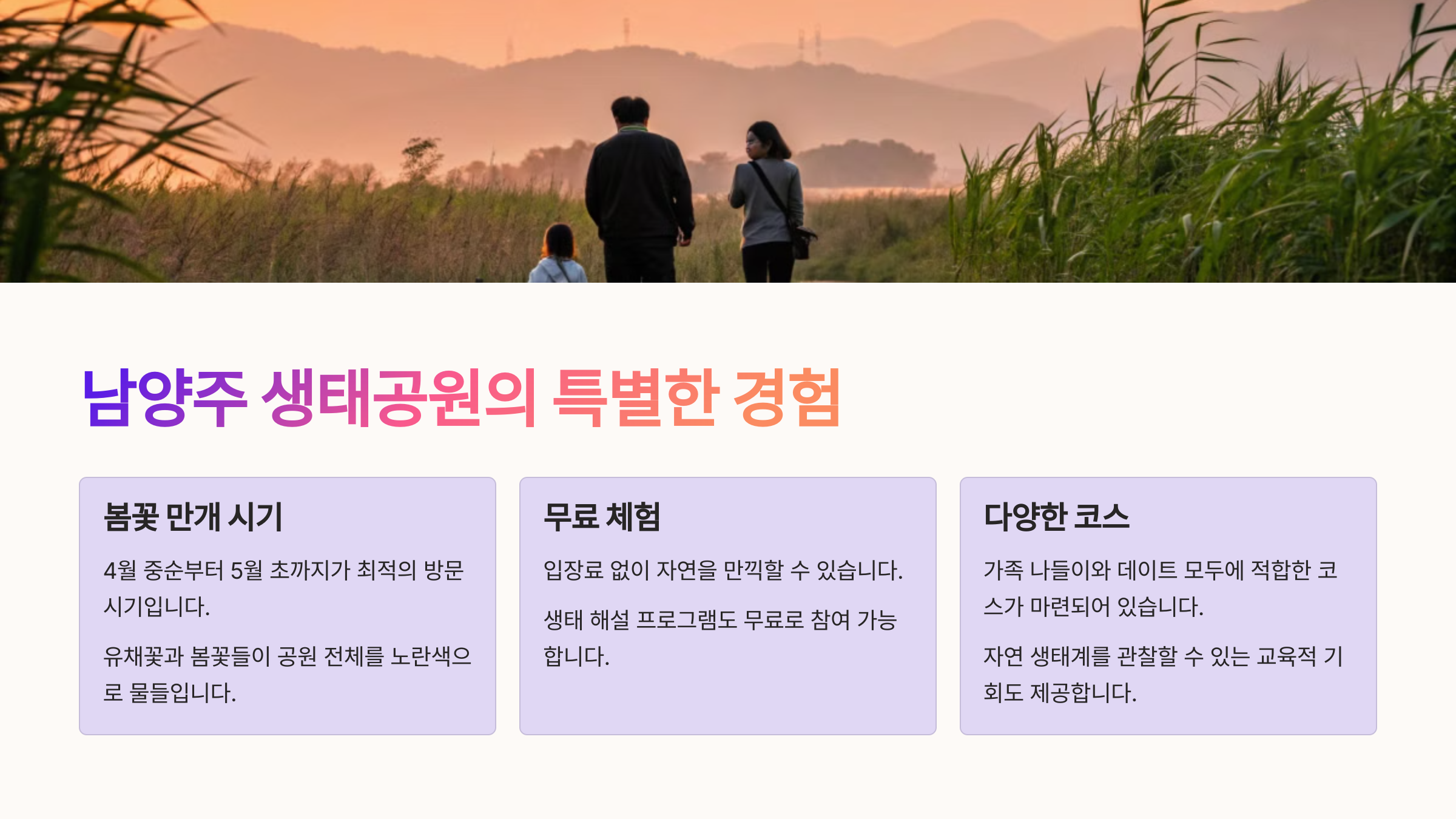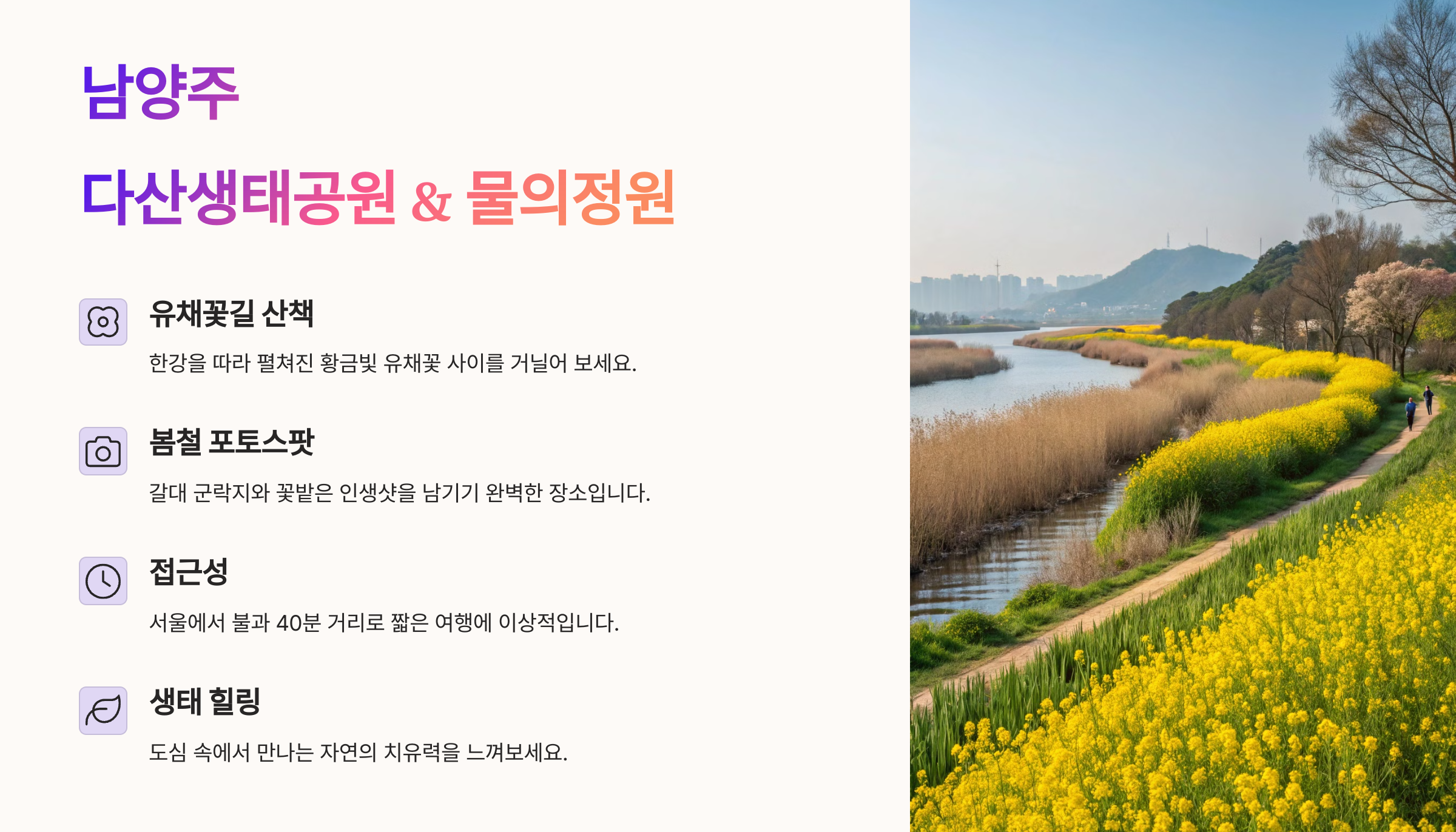 | 서울에서 가까운 자연 경관 명소 | 가족 단위 나들이에 적합한 장소 | 감성 가득한 사진 명소로 인기 |