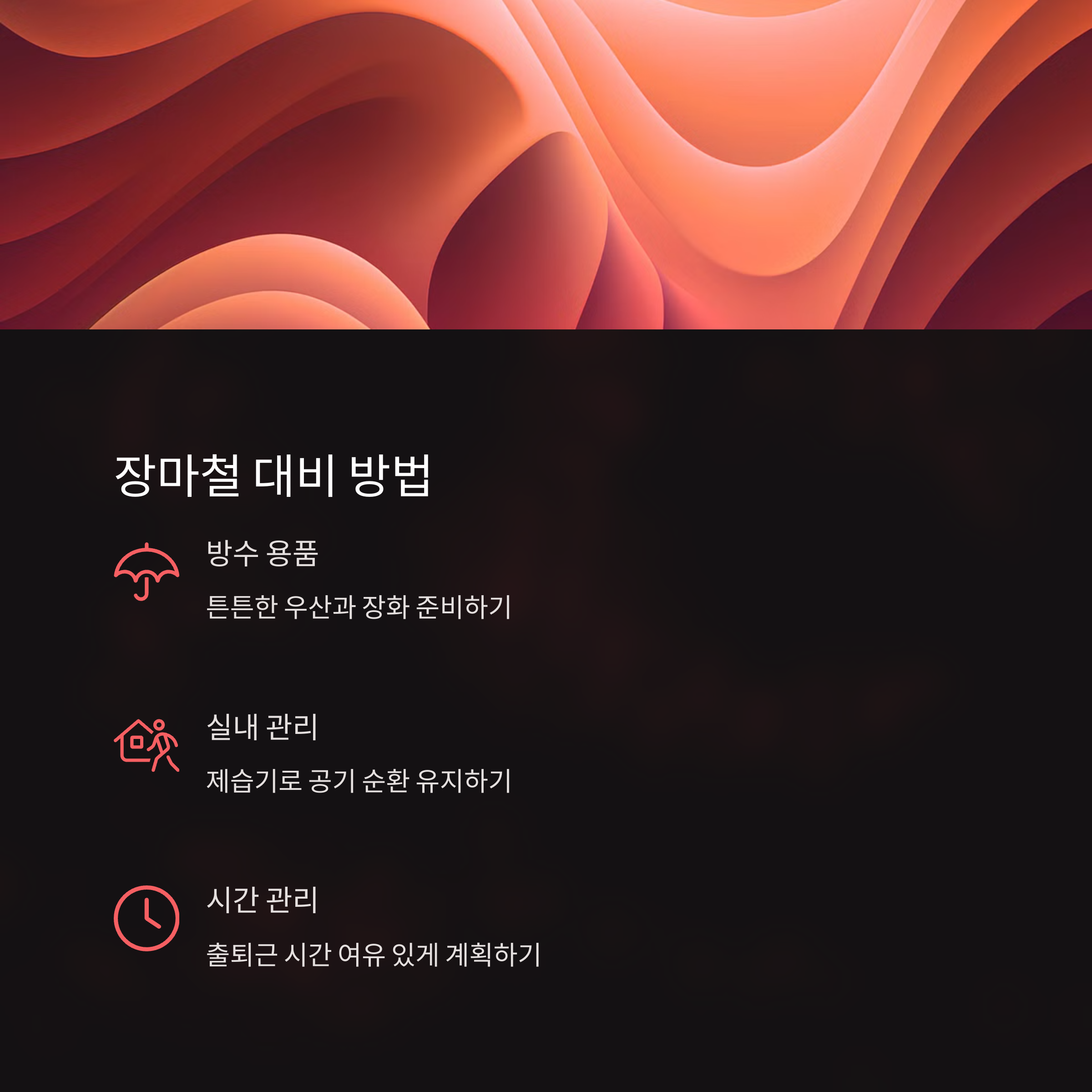 오늘 소개해드린 내용이 여러분의 장마철 생활에 도움이 되길 진심으로 바랍니다.