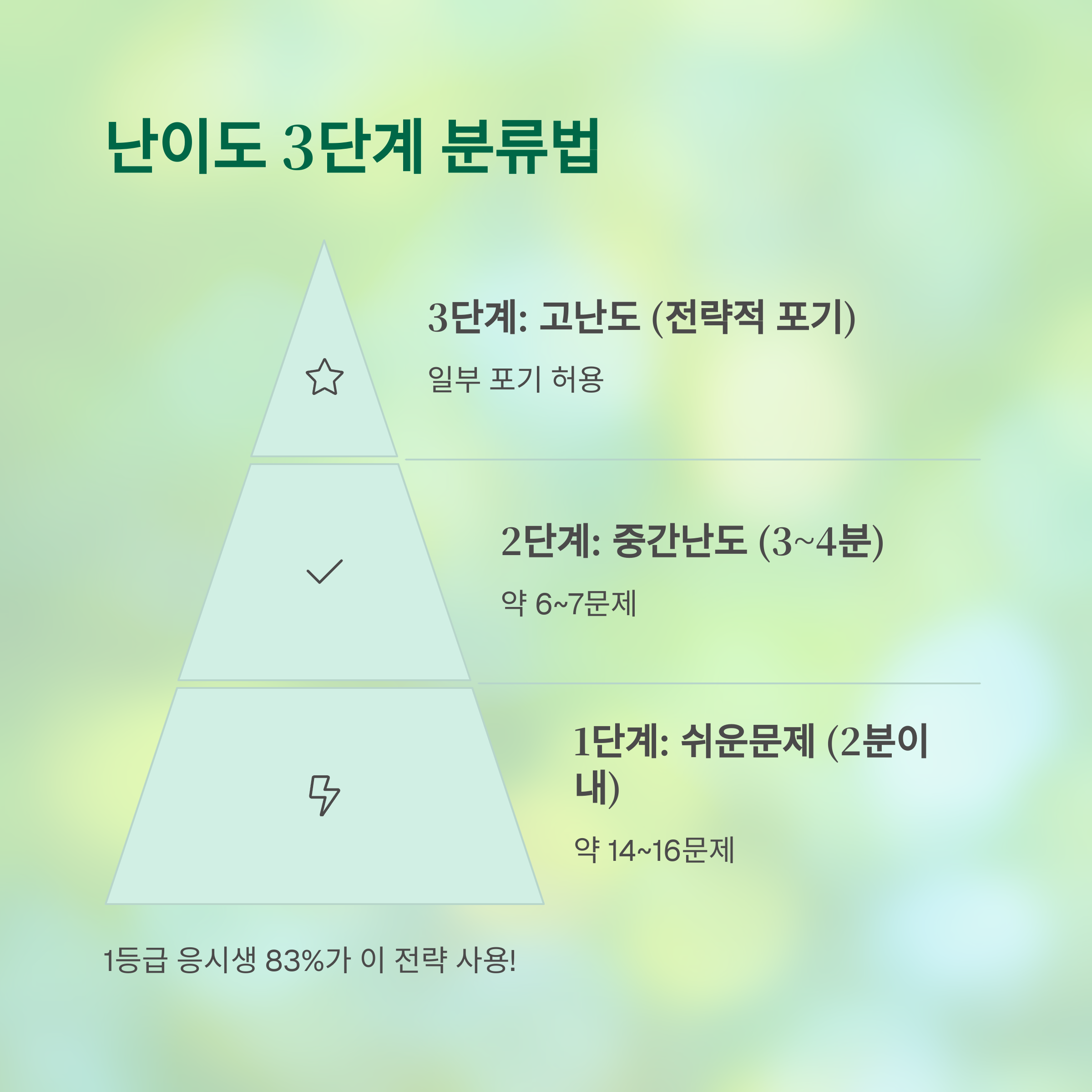 "한 문제에 2분 이상 잡히면 스킵"하는 것이 기본 전략입니다.
