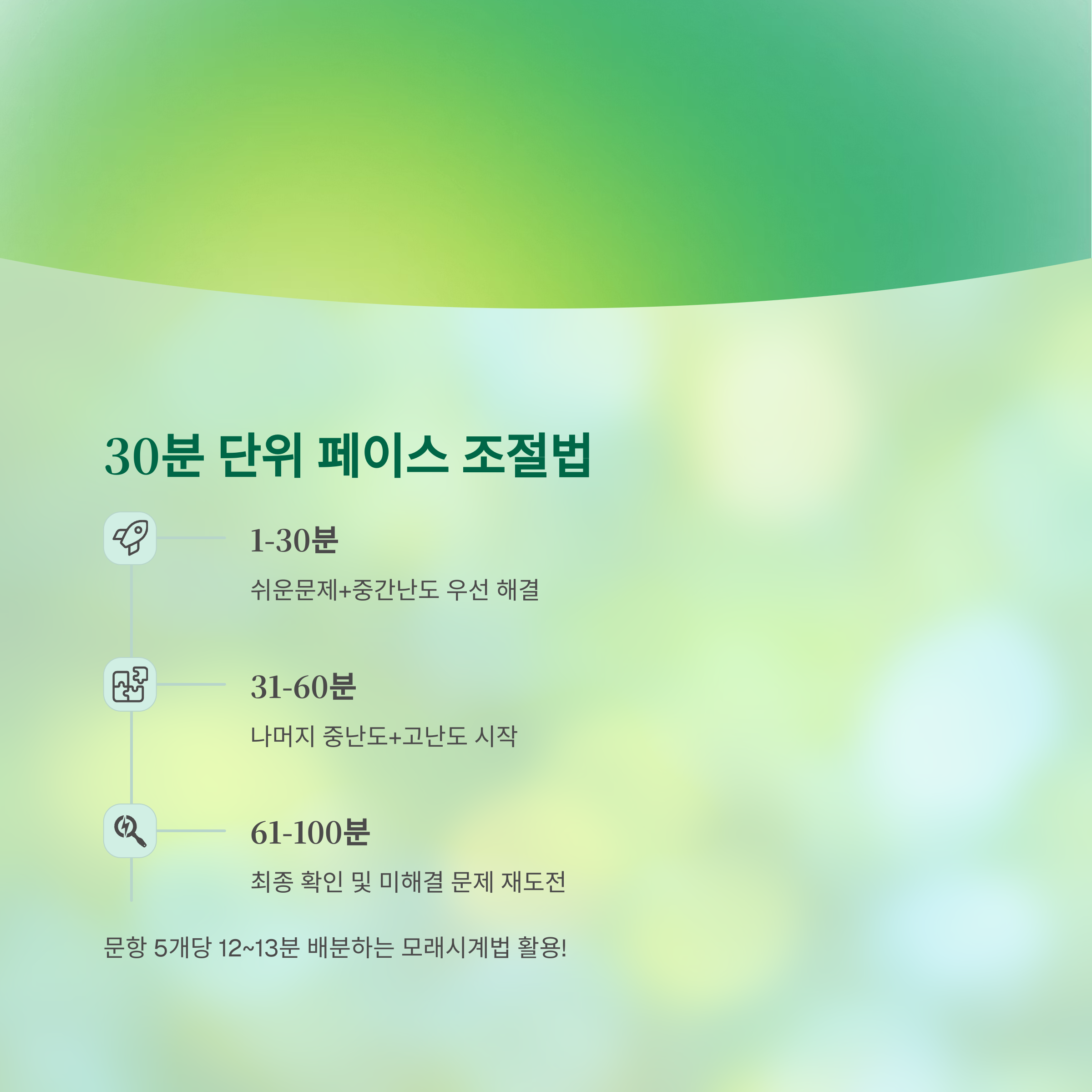 100분 시험 시간을 3등분하여 30분 단위로 진행 상황을 점검합니다.