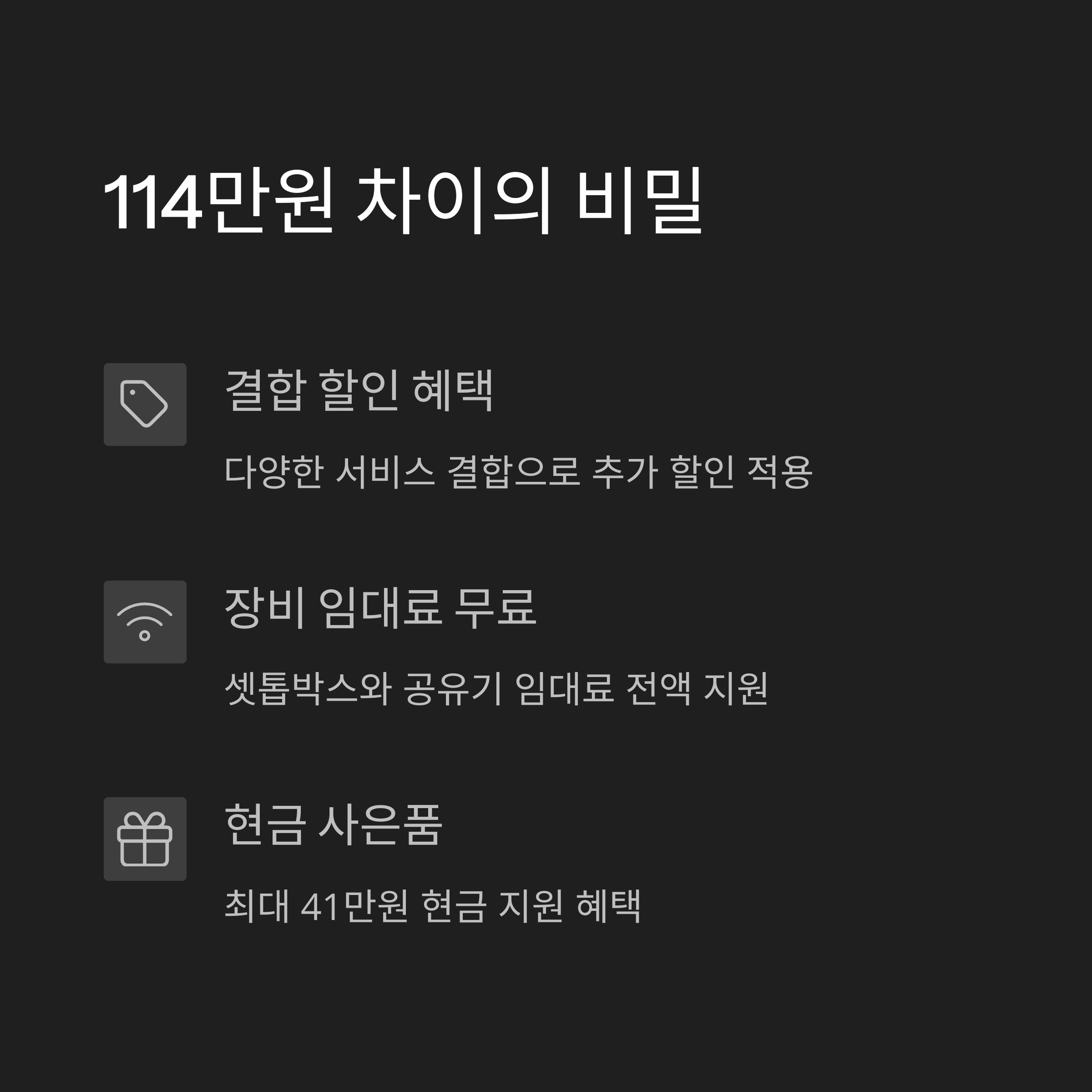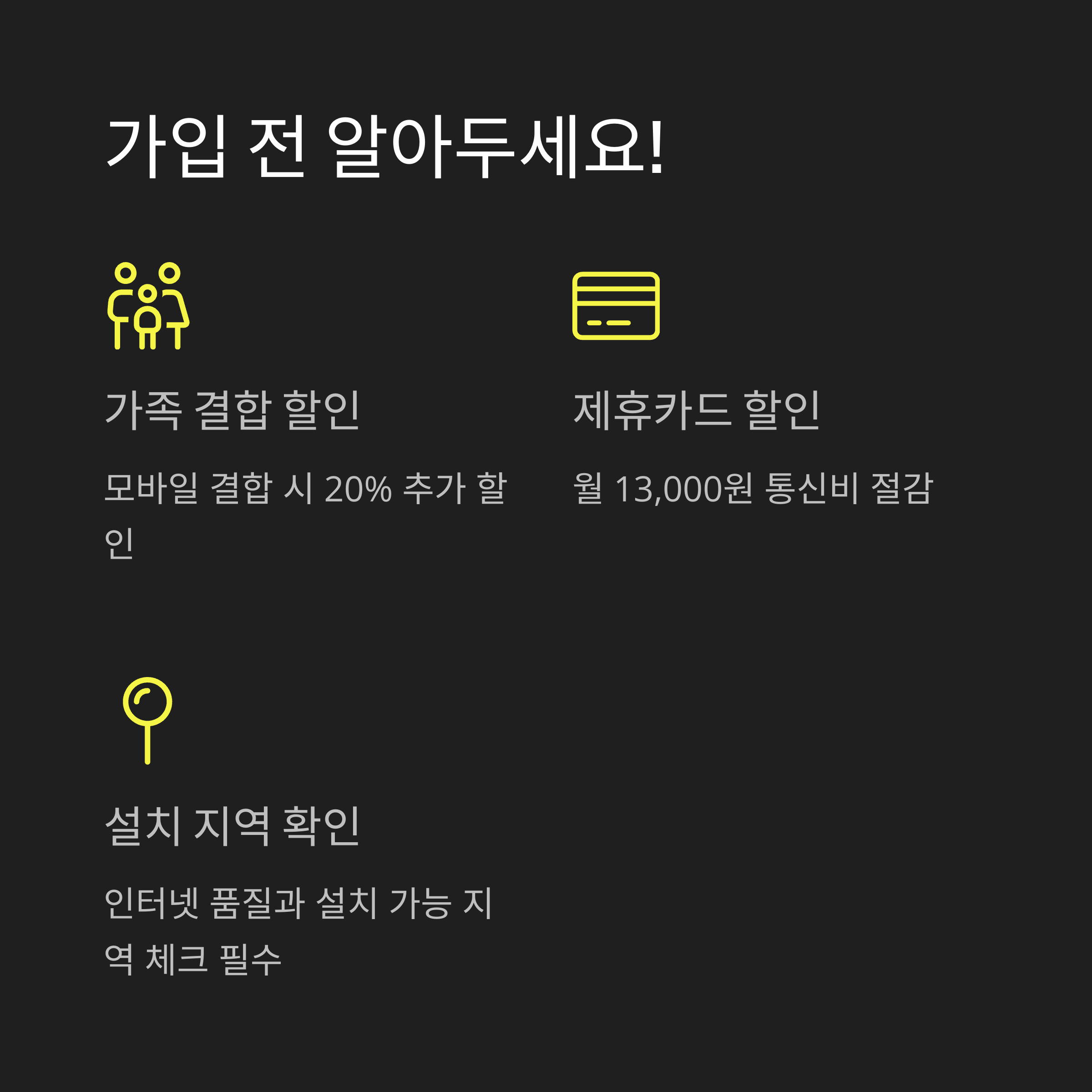 특히 단독 인터넷 가입 시에도 파격적인 가격 혜택을 받을 수 있어, 인터넷만 필요한 1인 가구, 자취생, 부모님 댁 등에 딱 알맞은 선택이랍니다.