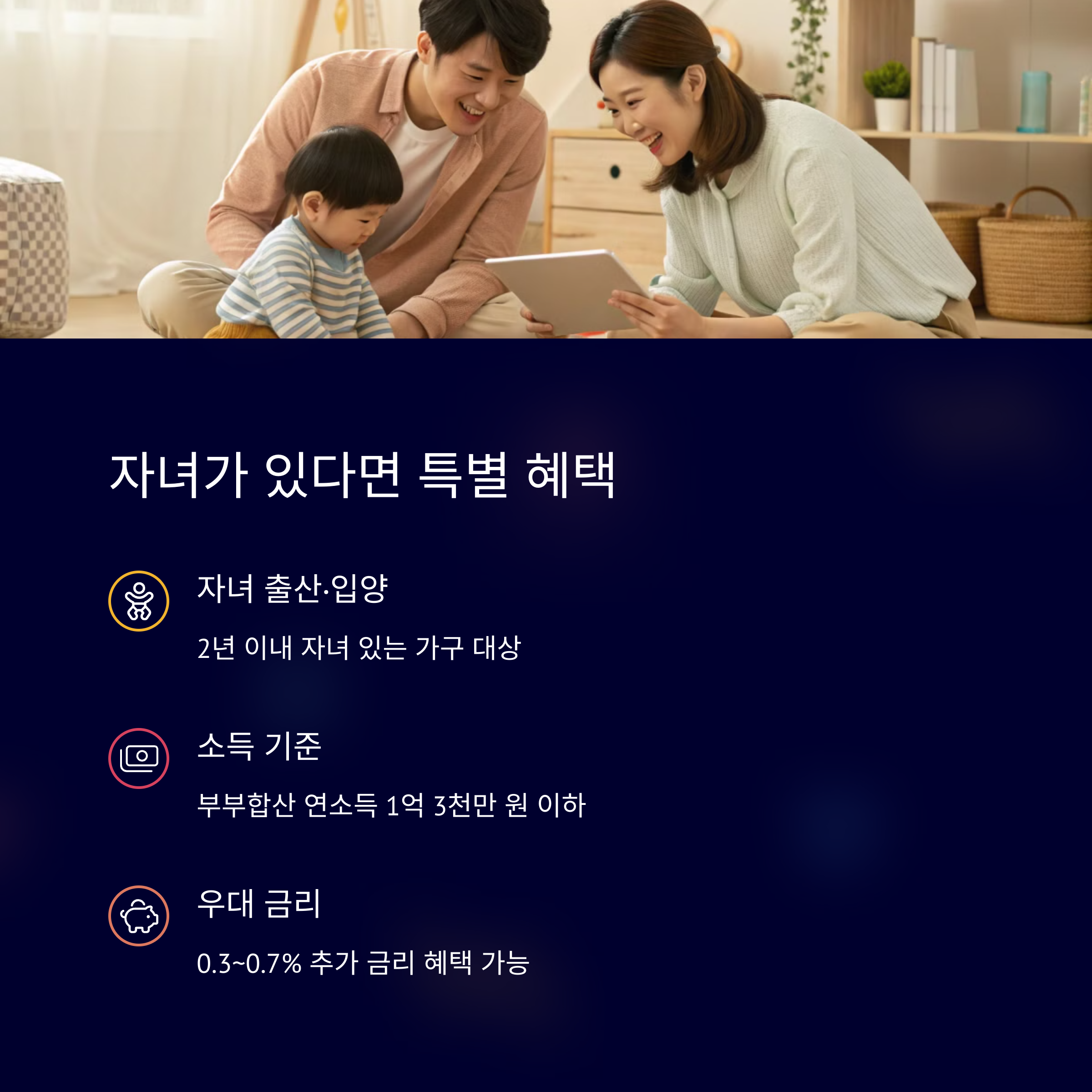 | 금리 우대 및 소득 기준 완화 가능 | 예비 청약 및 특별공급 제도 적극 활용 | 육아에 적합한 환경과 저렴한 분양가 |