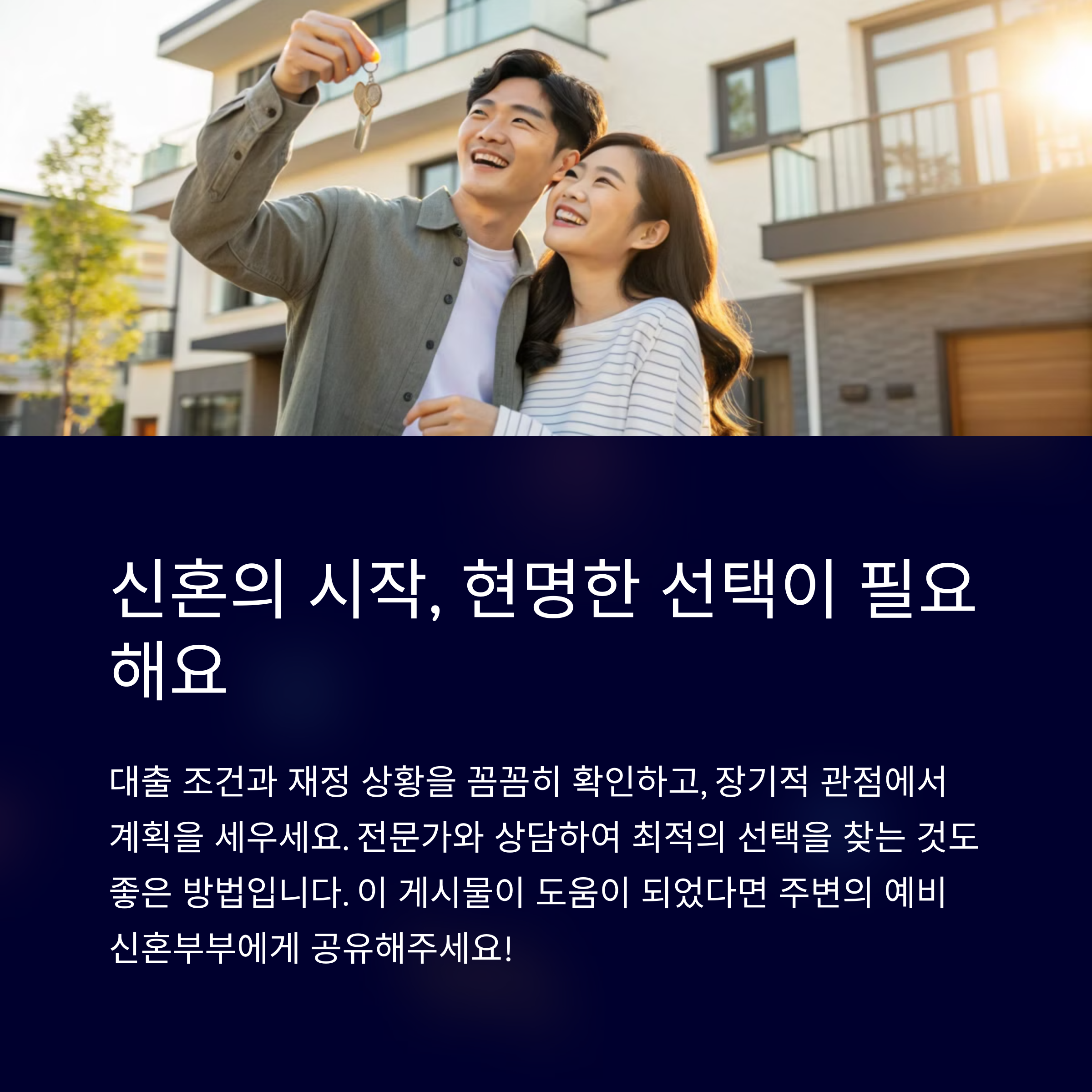 신혼부부가 주거지를 선택할 때 가장 먼저 고려해야 할 것은 현실적인 재정 상태입니다. 결혼 준비에 들어간 비용뿐만 아니라, 앞으로 발생할 생활비와 자녀 계획까지 모두 포함한 장기적인 재무 계획이 필요합니다. 특히 대출을 활용할 경우에는 이자율 변화, 상환 부담 등을 철저히 검토하고, 무리한 매매보다는 안정적인 전세를 선택하는 것도 좋은 대안이 될 수 있습니다. 신혼이라는 타이틀 아래 감정적인 선택보다는, 미래를 내다보는 판단이 중요하다는 점을 기억해 주세요.
