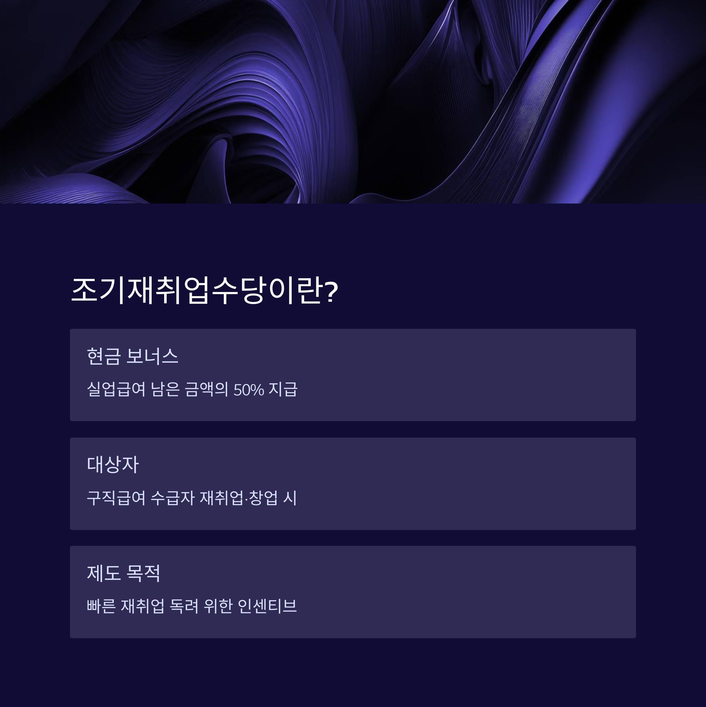 실업급여를 받는 도중 조기 취업하게 되면, 남은 실업급여의 50%를 현금 보너스처럼 지급받을 수 있는 제도입니다. 실업급여 수급자 중 빠르게 구직에 성공한 분들을 위한 인센티브라고 생각하시면 됩니다.