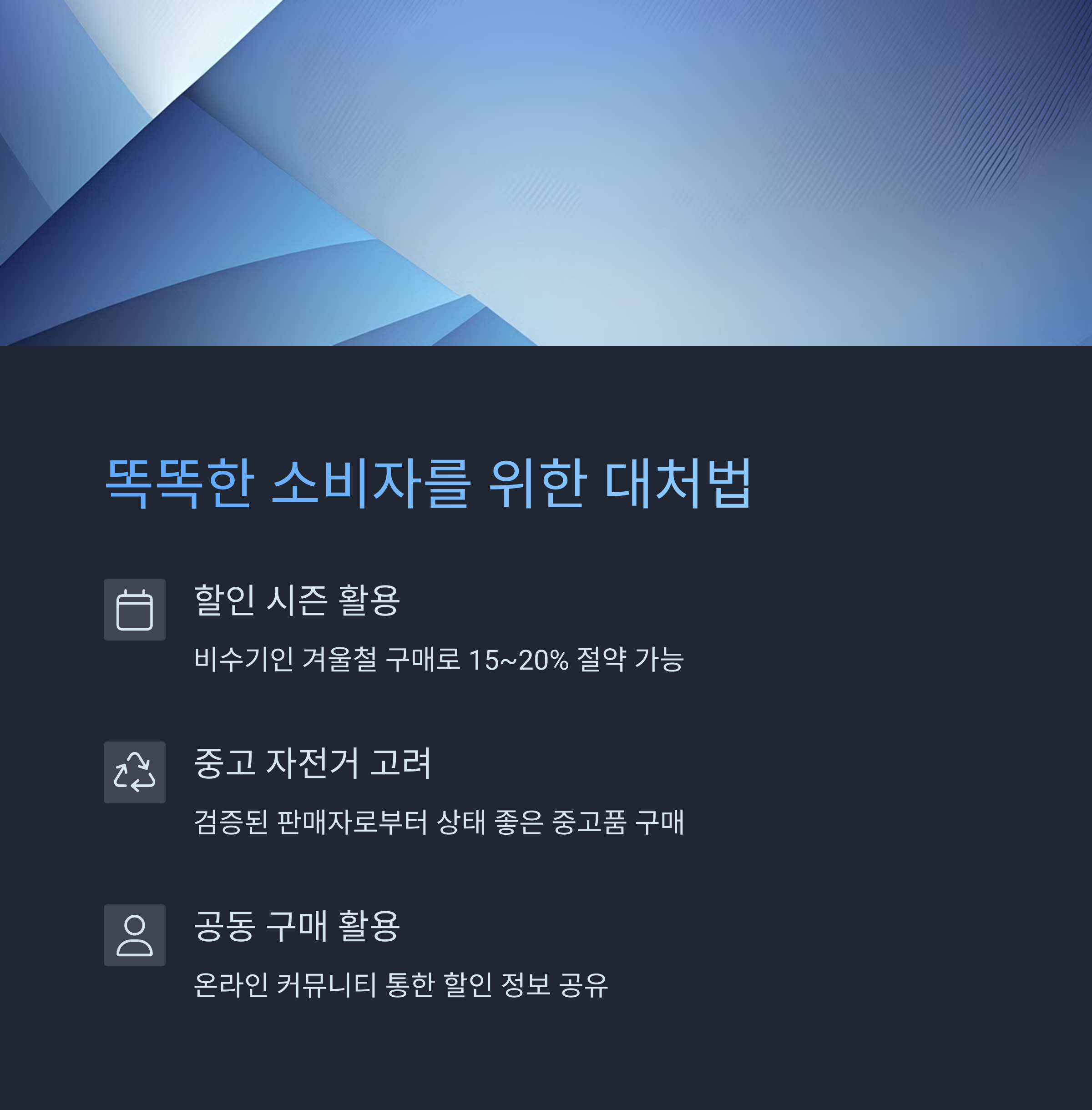 꼭 필요한 자전거라면, 지금 이 순간이 오히려 기회일 수도 있습니다. 신중한 비교와 선택으로 더 현명한 소비자가 되어보세요. 여러분의 건강하고 즐거운 라이딩을 언제나 응원합니다!