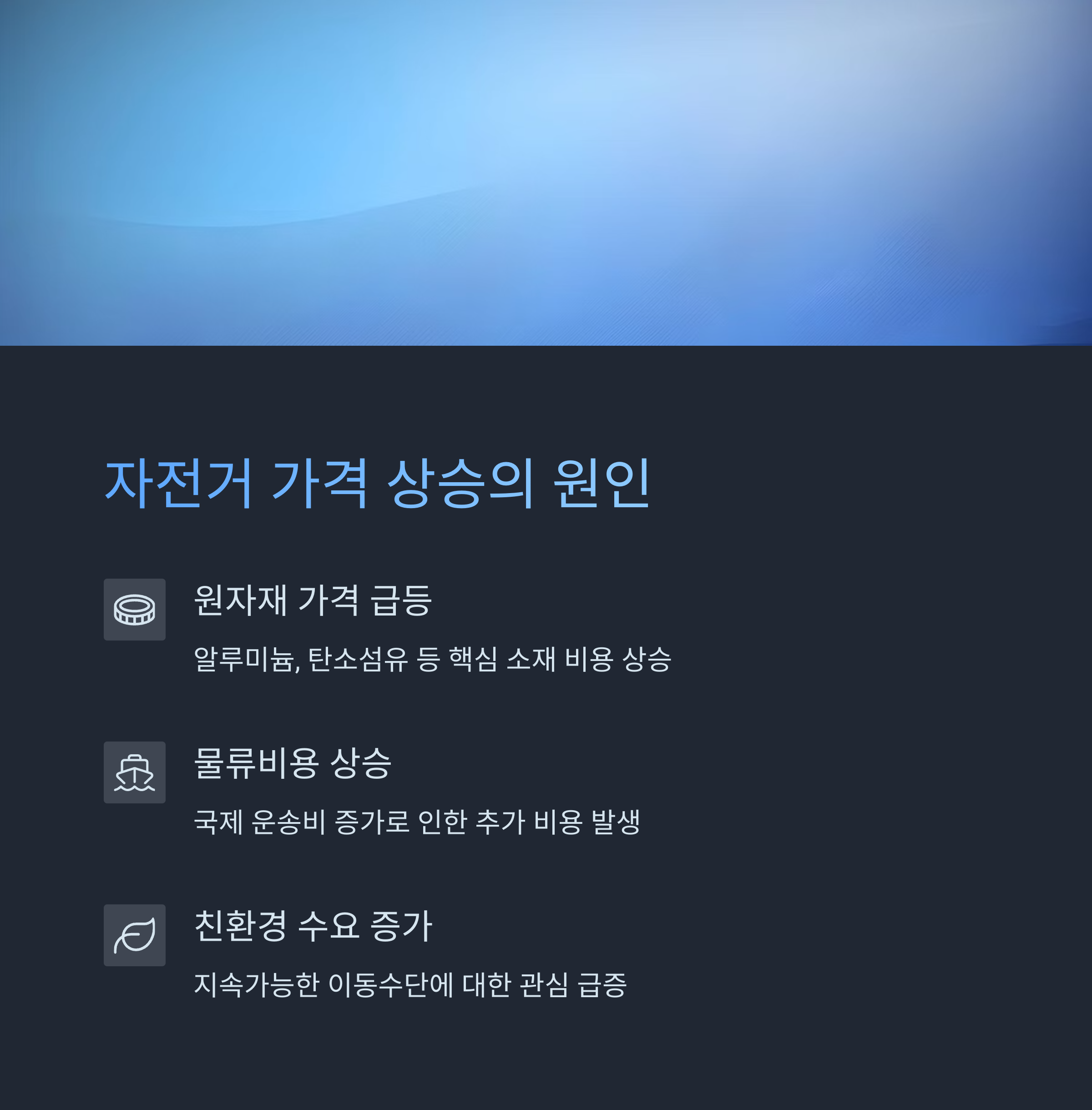 2025년 자전거 가격이 37% 상승한 배경에는 다양한 요인이 복합적으로 작용했습니다. 특히 원자재 가격의 급등과 물류 비용 상승은 제조업 전반에 영향을 미쳤고, 자전거 역시 예외는 아니었습니다.