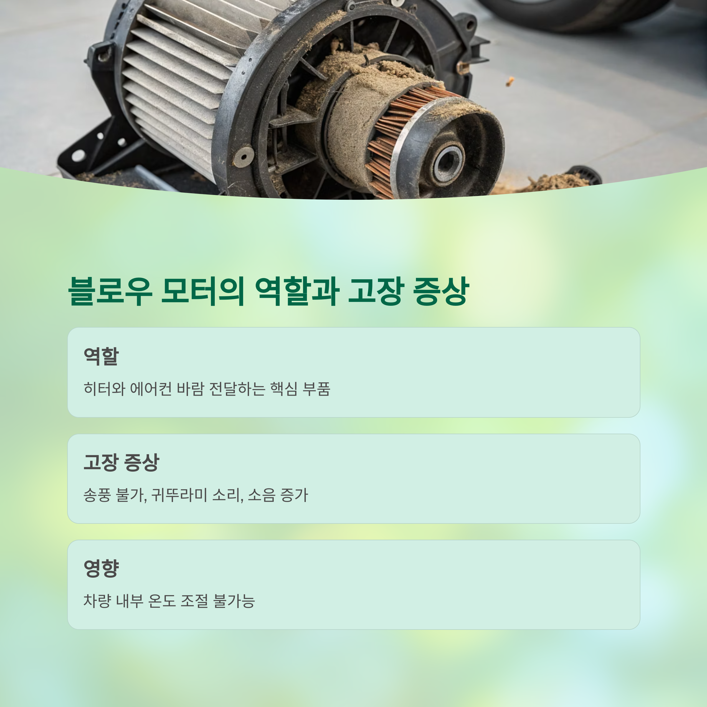 이 모터가 고장 나면 송풍이 안 되거나 이상한 소리가 나며, 냉난방이 거의 불가능해집니다.