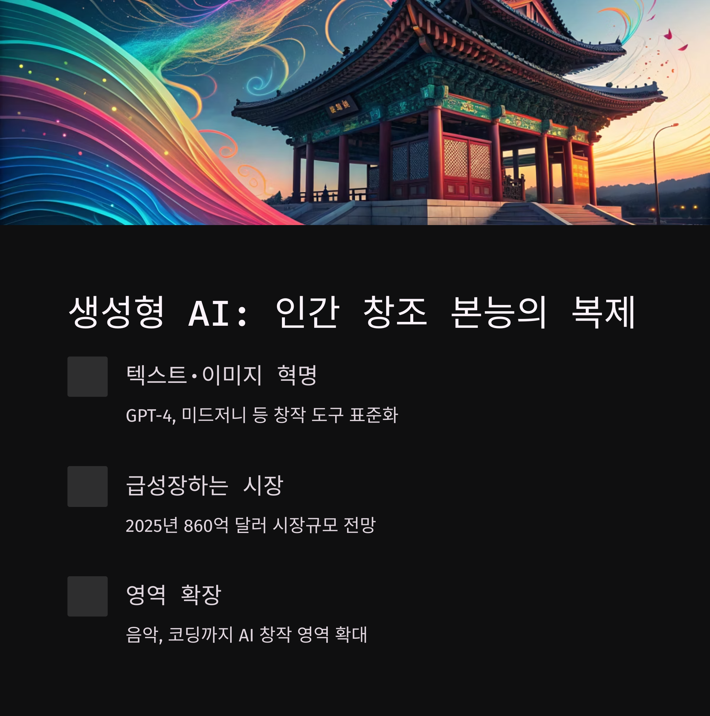 텍스트, 그림, 음악, 영화 제작까지 AI가 실제 '창작자' 역할을 하게 된 것입니다.