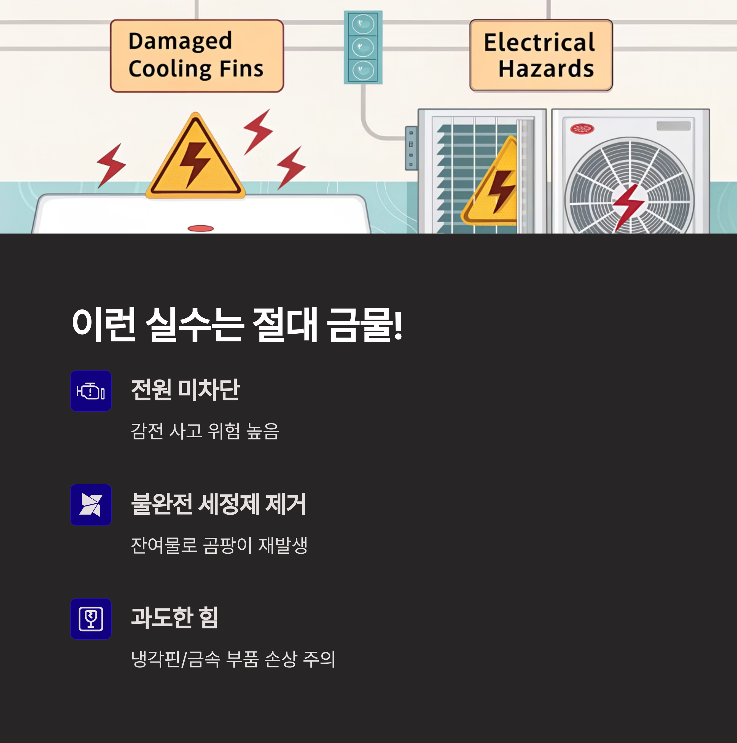 결국 냉방 능력 저하, 전기요금 증가, 악취 발생, 알레르기 유발로 이어질 수 있습니다.