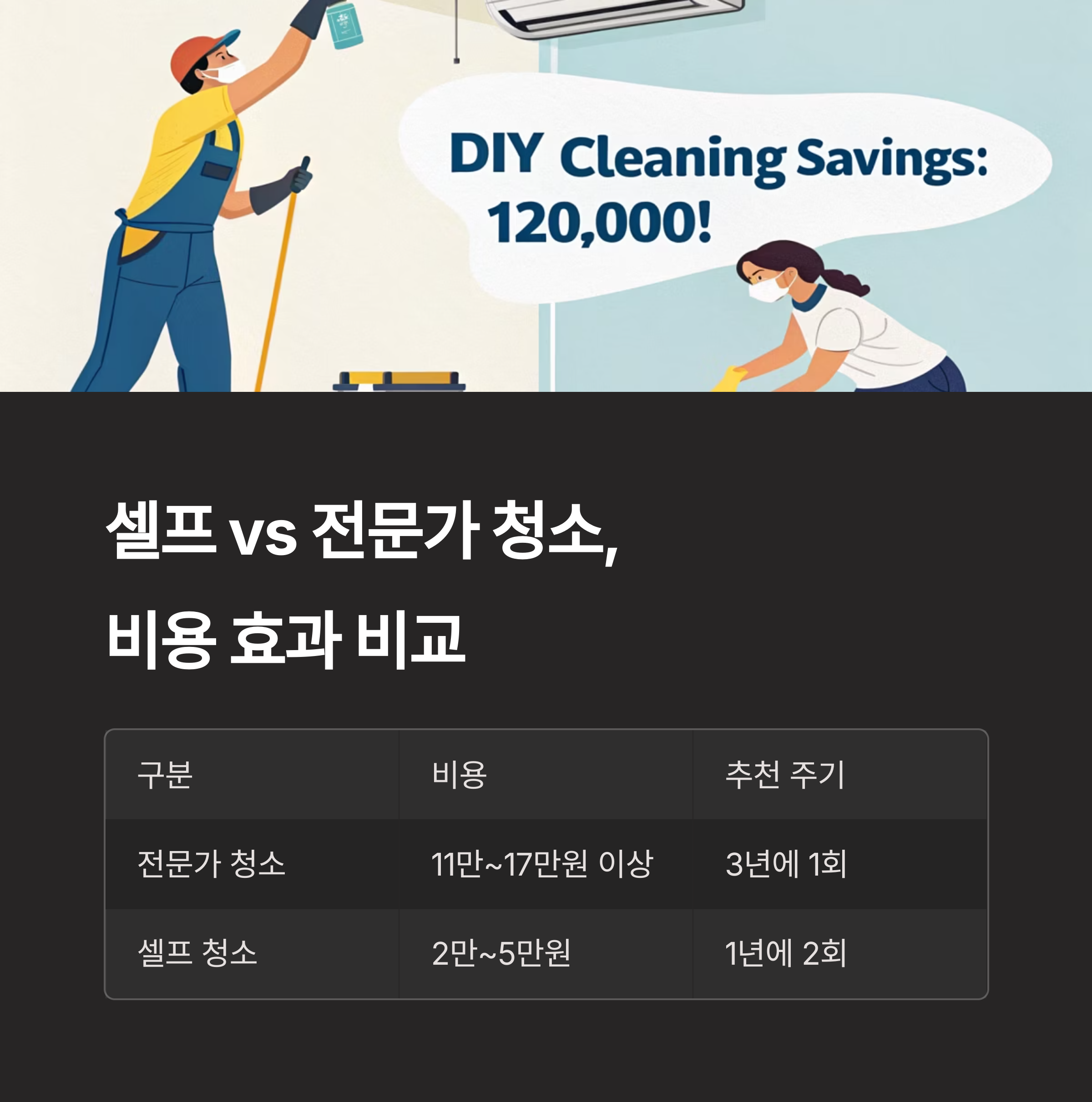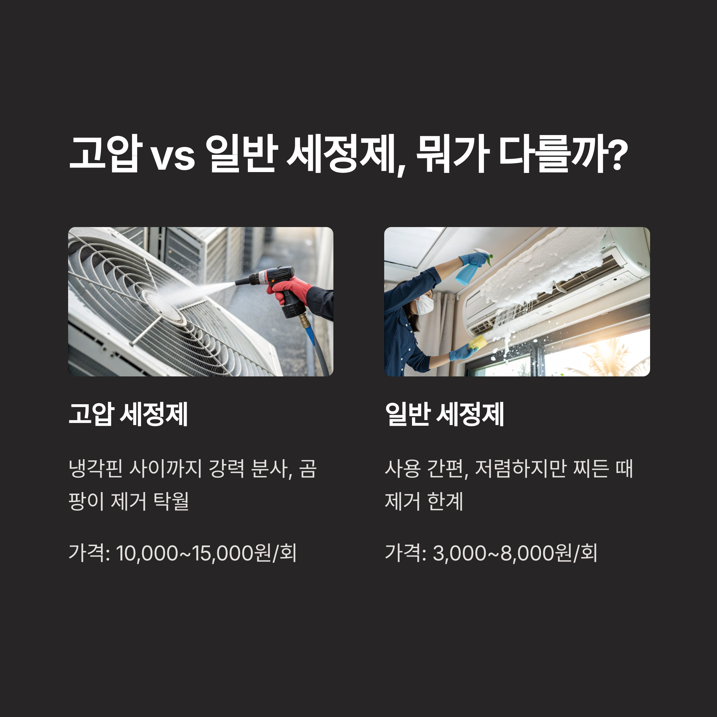 | 에어컨 자주 사용 | 고압 세정제+고급 커버 | 냉각핀 깊은 청소 가능 |