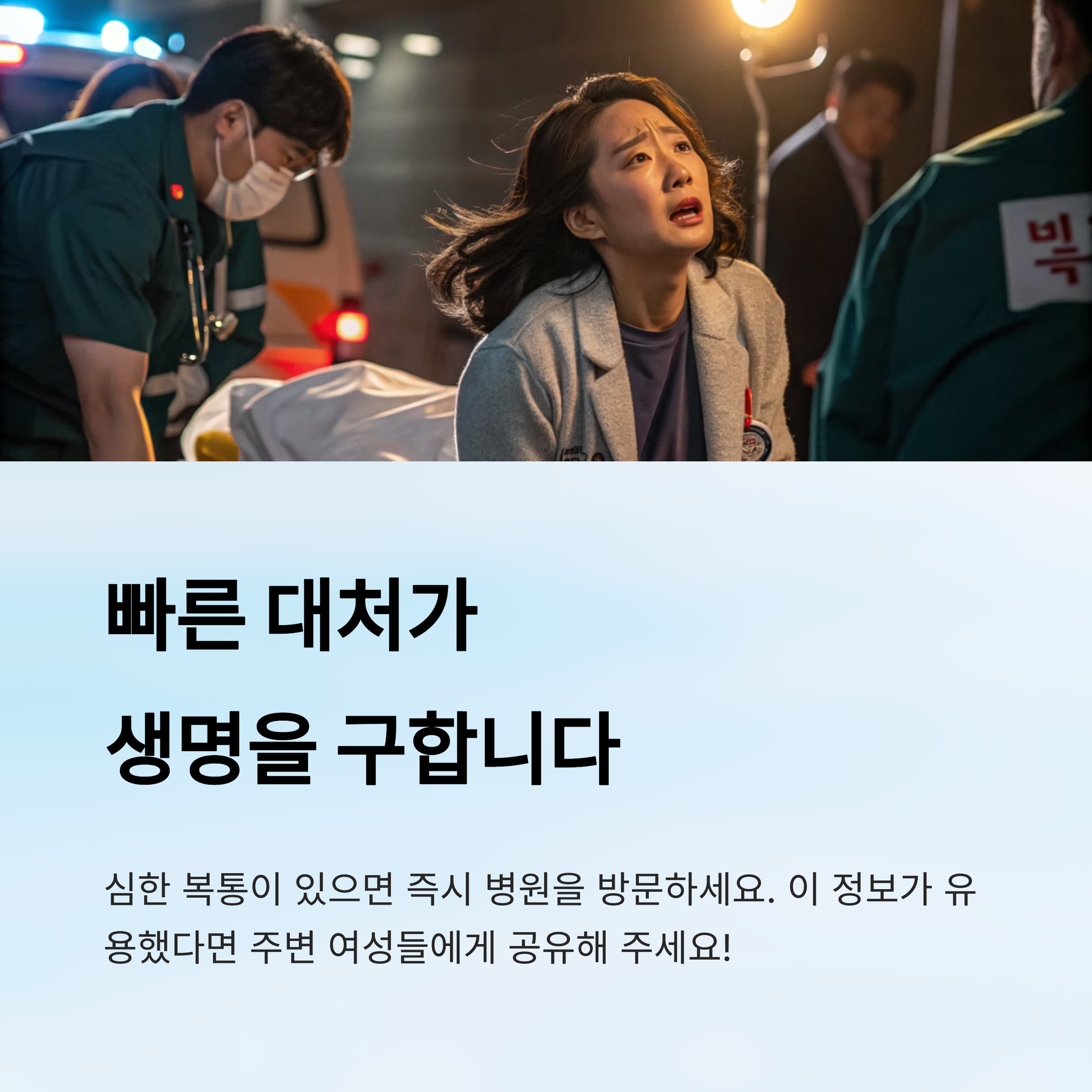 "처음에는 생리통인 줄 알았어요. 그런데 통증이 점점 심해지고 땀이 나기 시작했죠. 응급실에 가보니 자궁외임신이 파열된 상태였어요. 복강 내 출혈로 응급수술을 받았고, 2시간만 늦었으면 위험할 뻔했다는 말을 들었습니다. 여성의 복통, 절대 가볍게 보지 마세요."