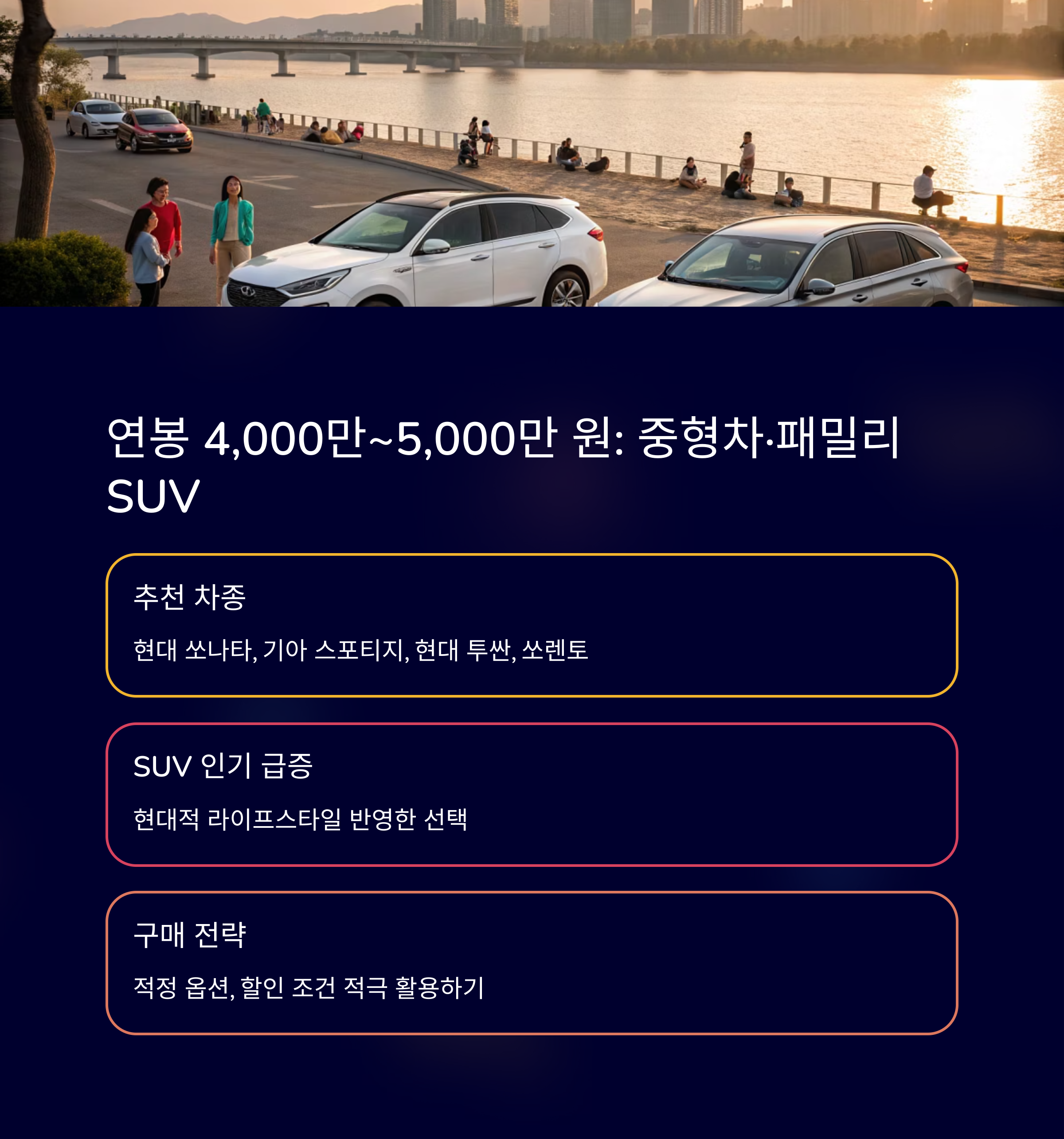 | 4,000만 원 | 준중형~중형 | 아반떼, 셀토스, K5, 니로 하이브리드 |