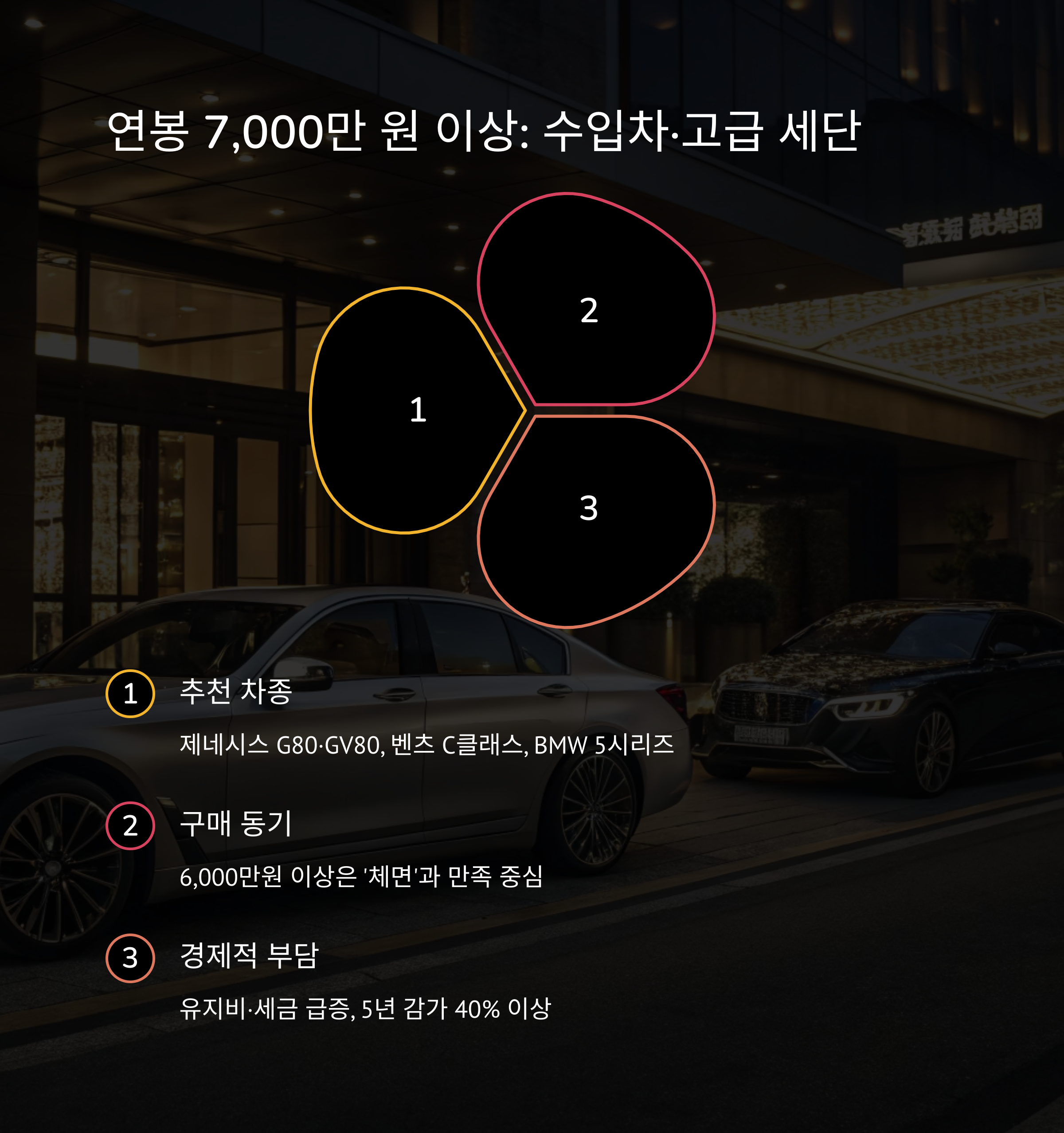 | 고급 수입차 (5천 이상) | 벤츠 E클래스, GLE, 제네시스 G80 | 성공한 사업가, 의사, 변호사 등 |