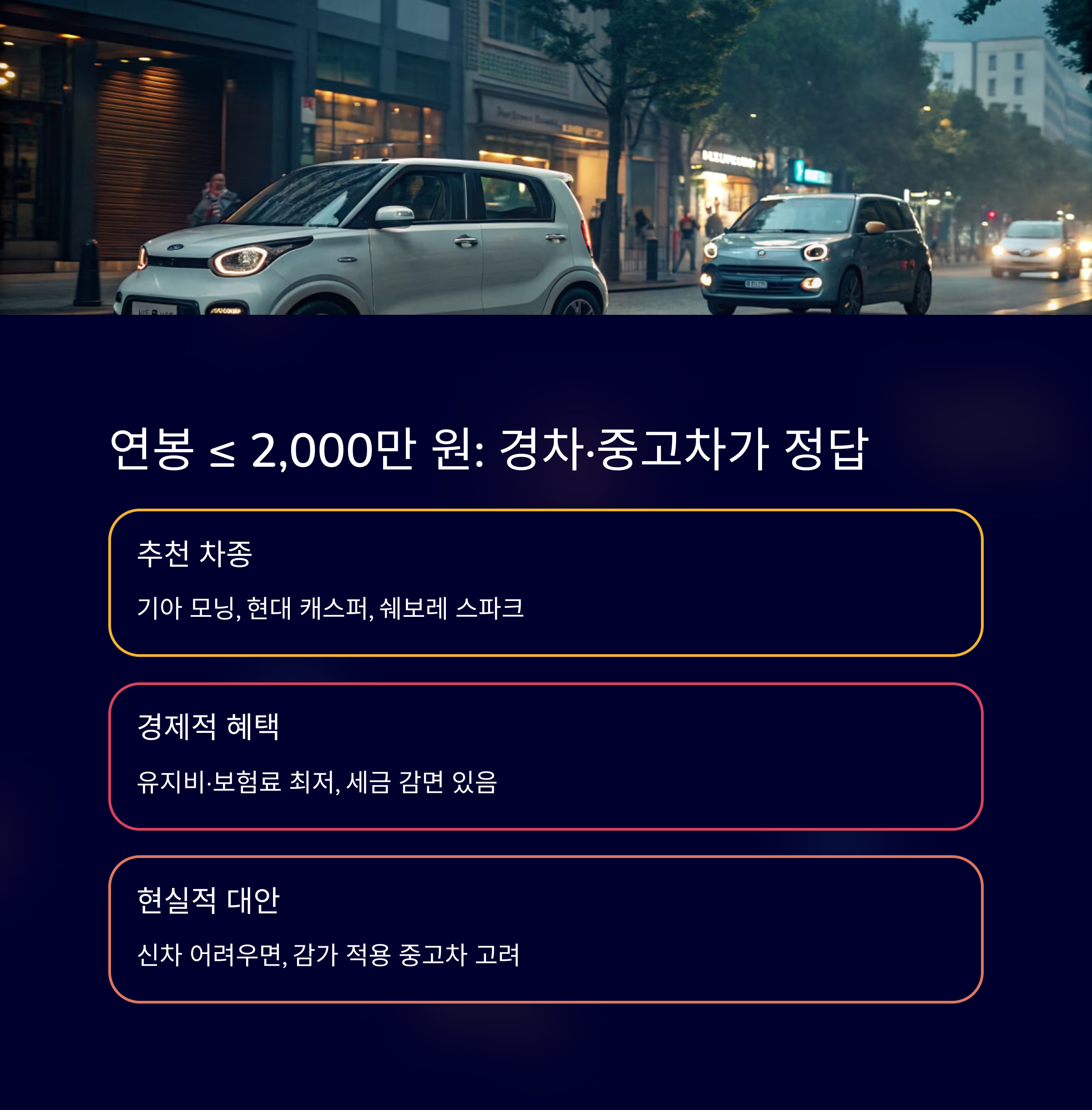 | 3,000만 원 | 경차/소형차 | 모닝, 레이, 스파크, 중고 K3 |