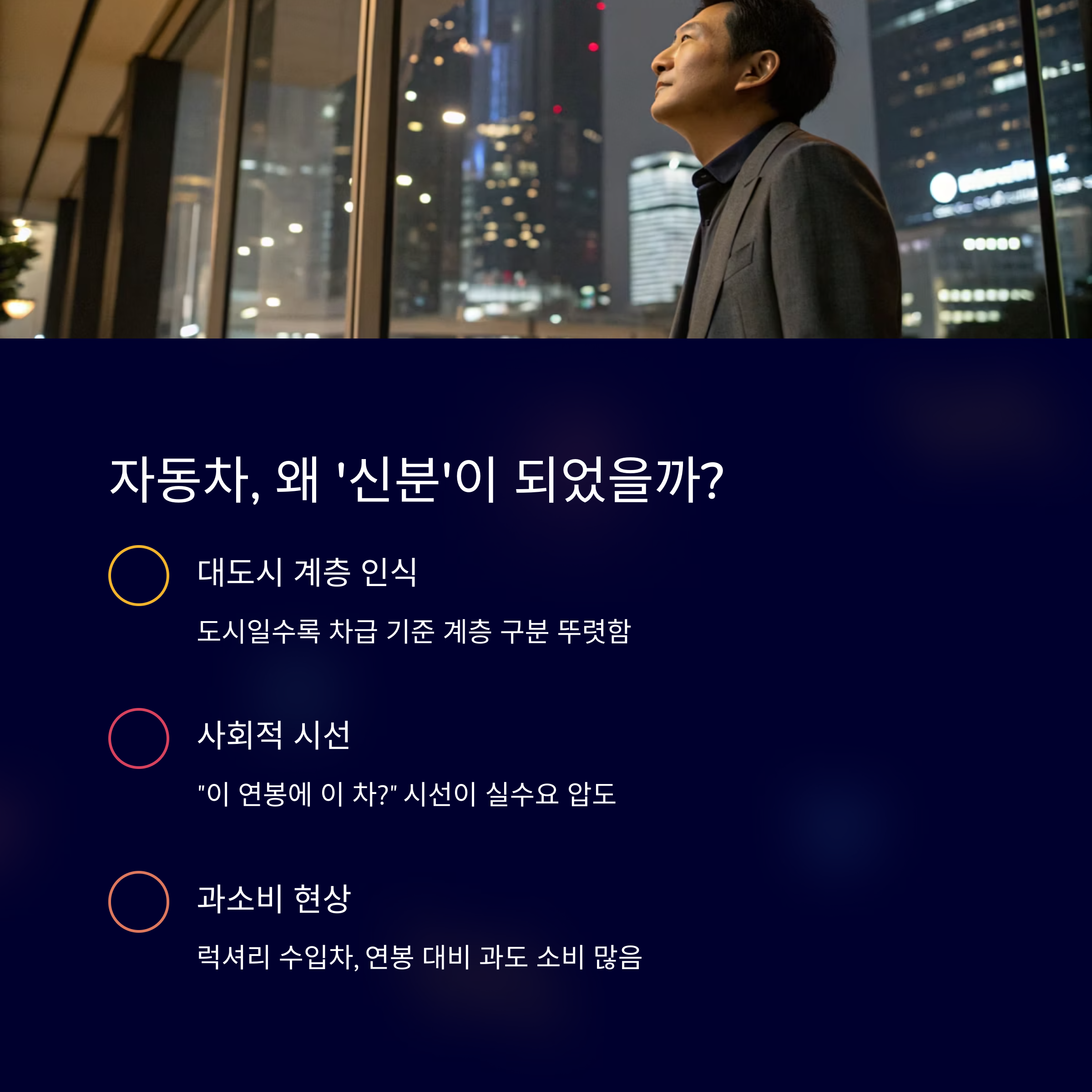 "자동차는 과시보다 효율, 경쟁보다 나와의 합의가 중요한 소비입니다."