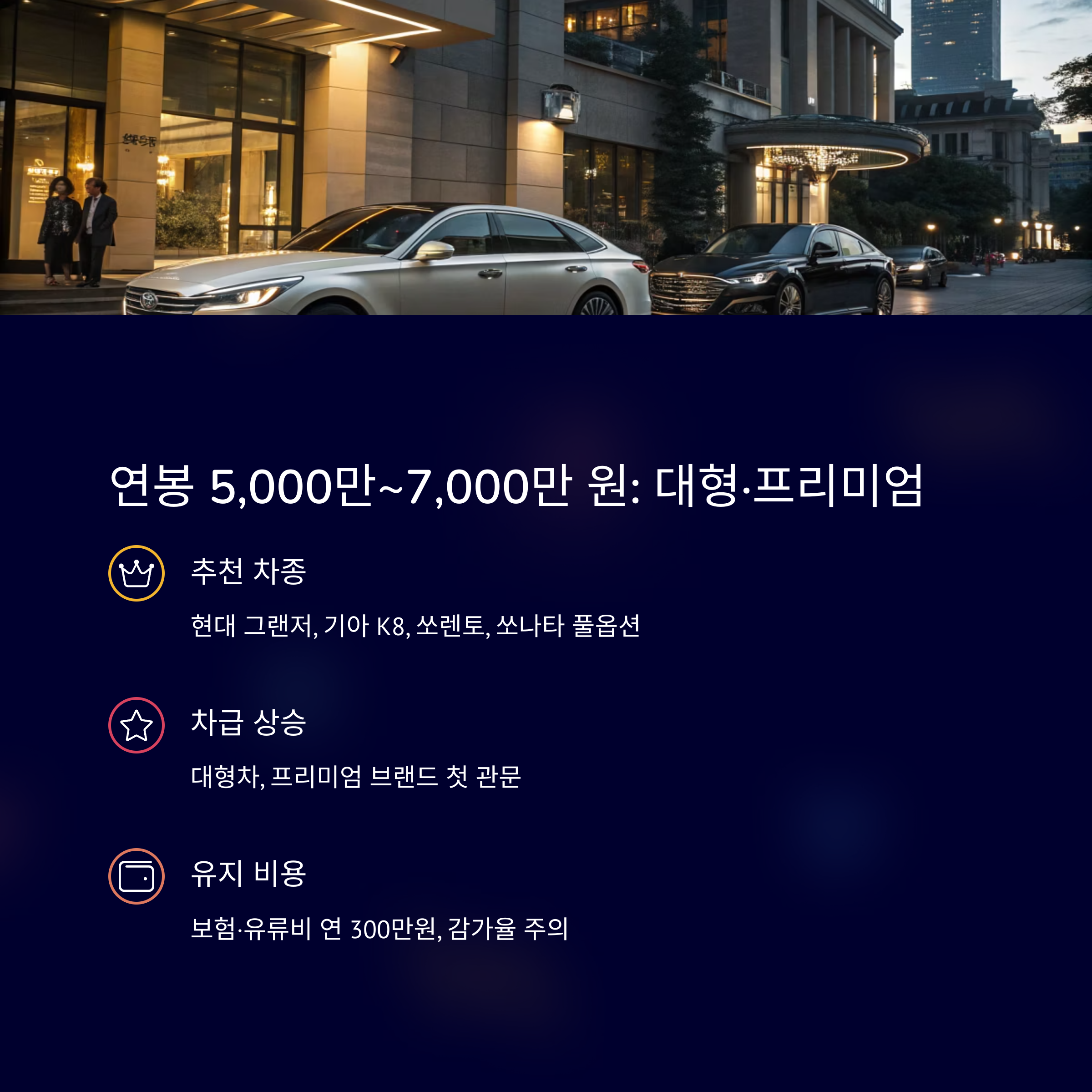 | 5,000만 원 | 중형세단·SUV | K8, 스포티지, 투싼, 그랜저 하이브리드 |