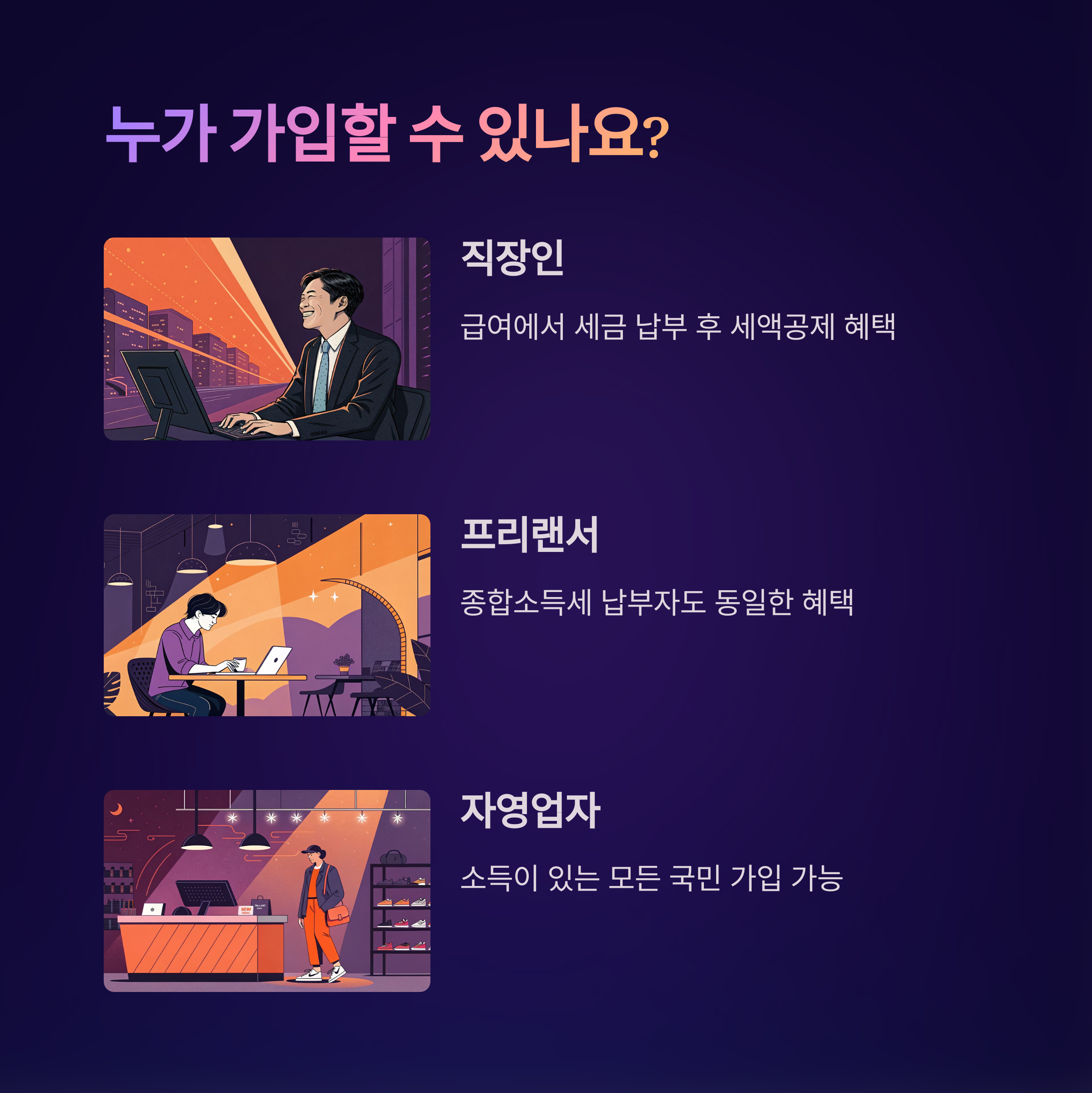 소득이 있는 대한민국 국민이라면 누구나 가입 가능합니다.